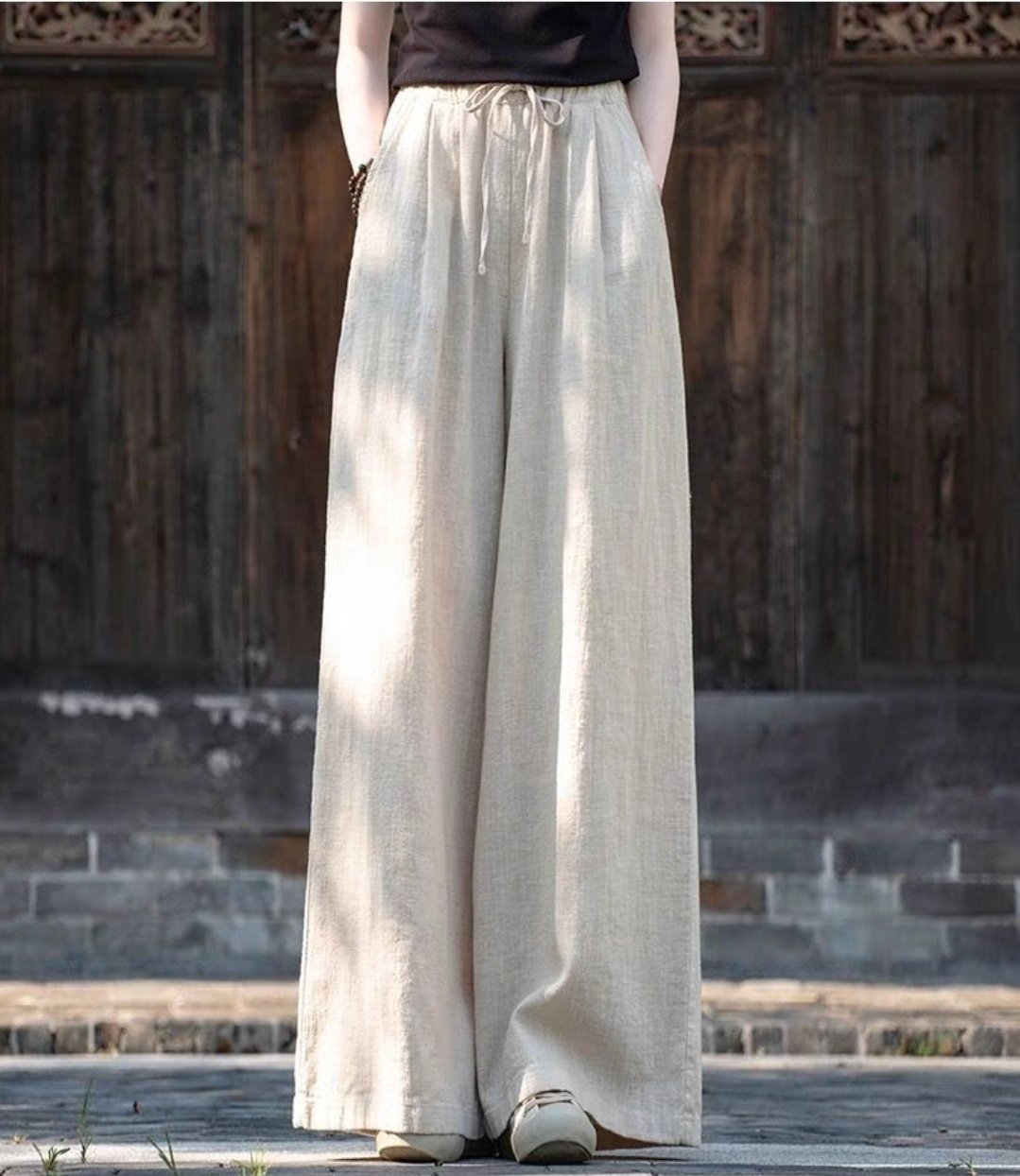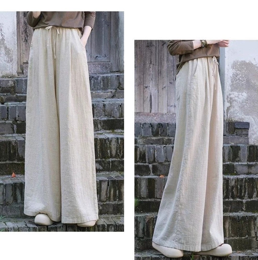 THÔNG TIN SẢN PHẨM: - Sản phẩm: Quần dài nữ - Chất liệu: Linen - Đặc điểm: Ống rộng, Đũng ngắn, Lưng thun - Kích thước: M, L, XL, 2XL - Màu sắc: Trắng,Đen,Be,Muối