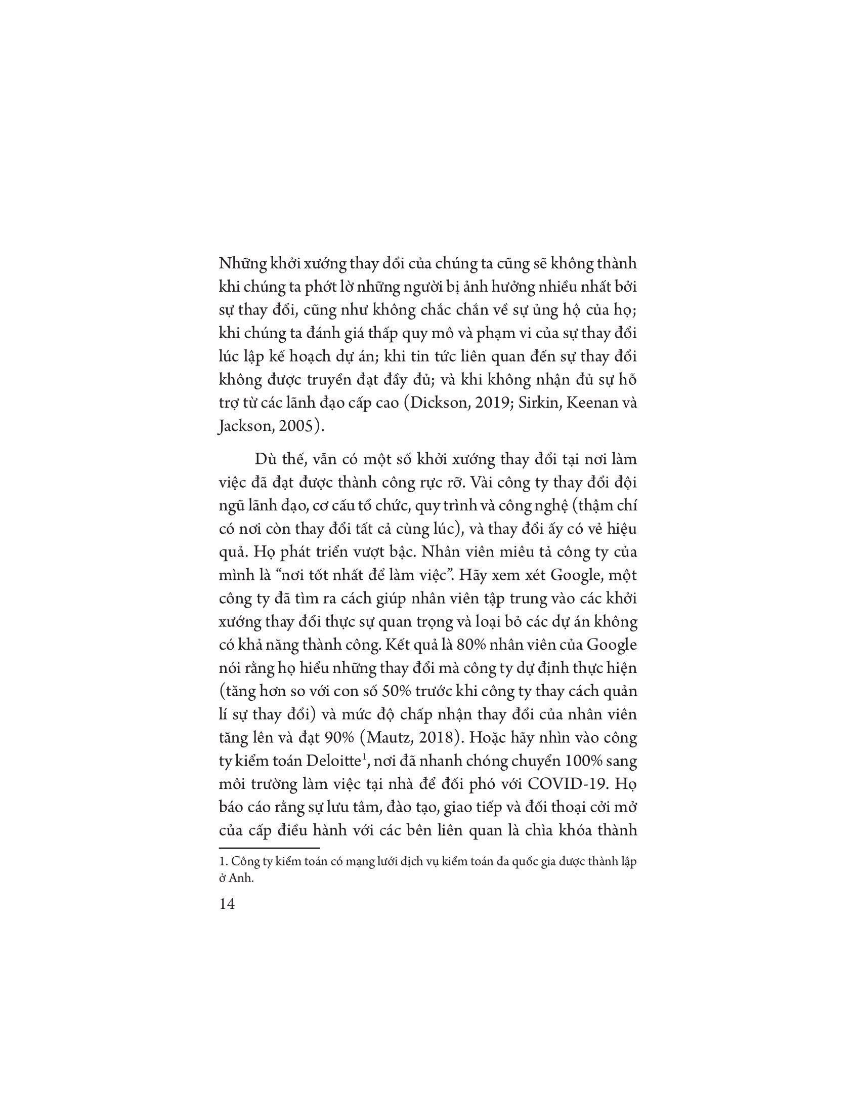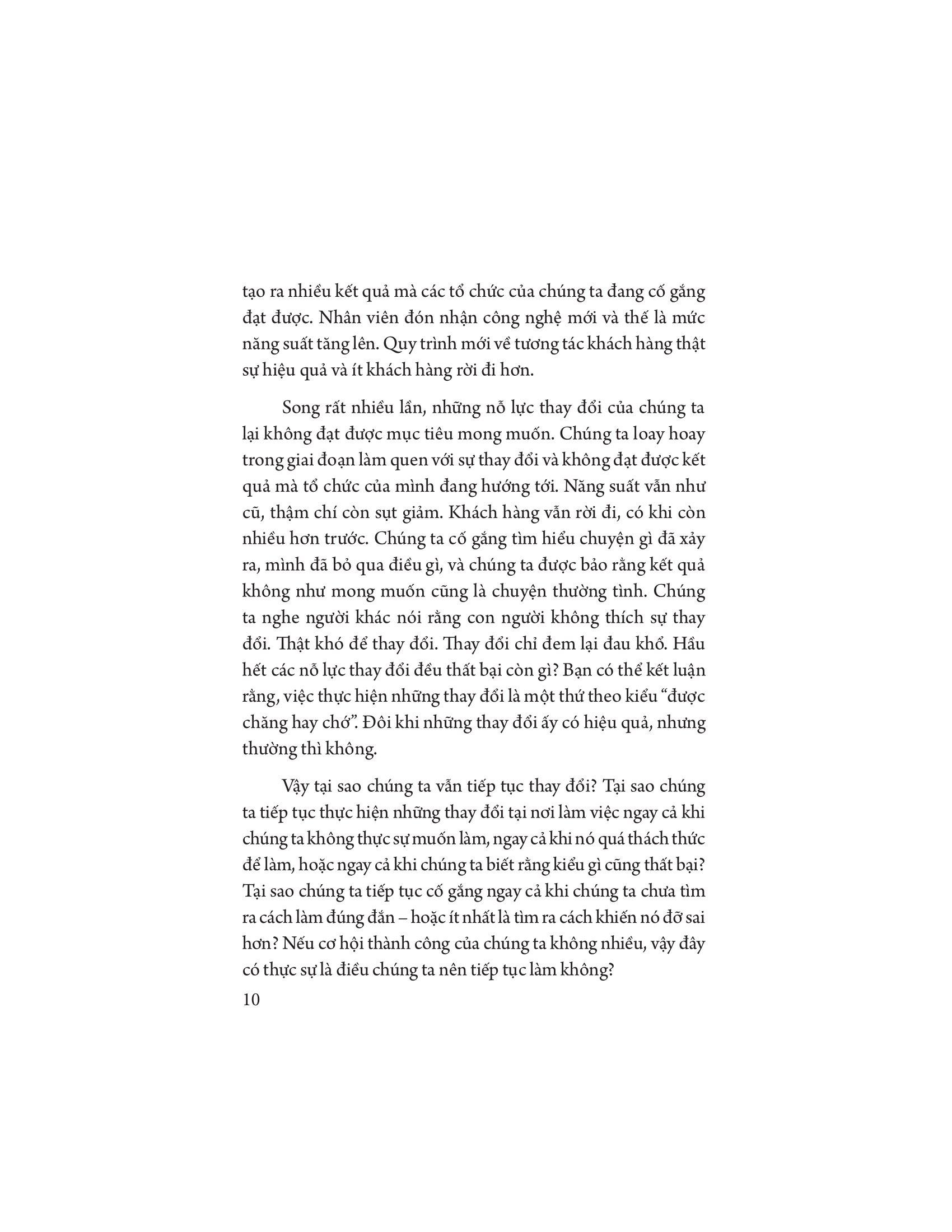 Trong công việc, và có khi cả trong đời sống cá nhân, chúng ta đều nghe người khác nói rằng chỉ có sự thay đổi là bất biến. Chúng ta đang sống trong một thế giới thiên biến vô cùng, được đặc trưng bởi sự biến động, không thể lường trước. Song rất nhiều lần, những nỗ lực thay đổi của chúng ta lại không đạt được mục tiêu mong muốn. Khách hàng rời đi, có khi còn nhiều hơn trước. Năng suất vẫn như cũ, thậm chí còn sụt giảm. Chúng ta cố gắng tìm hiểu chuyện gì đã xảy ra, m.ình đã bỏ qua điều gì, và chúng ta được bảo rằng kết quả không như mong muốn cũng là chuyện thường tình. Đôi khi những thay đổi ấy có hiệu quả, đôi khi lại không.
