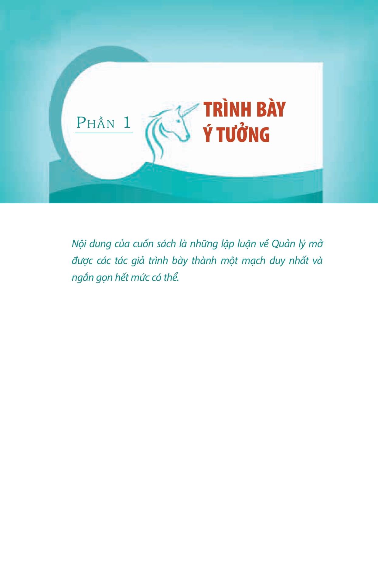 Phần 1 – Trình bày ý tuởng: là những lập luận về Quản lý mở trong một thế giới mới và cách thực hành quản lý qua mô hình của Teal Unicorn.