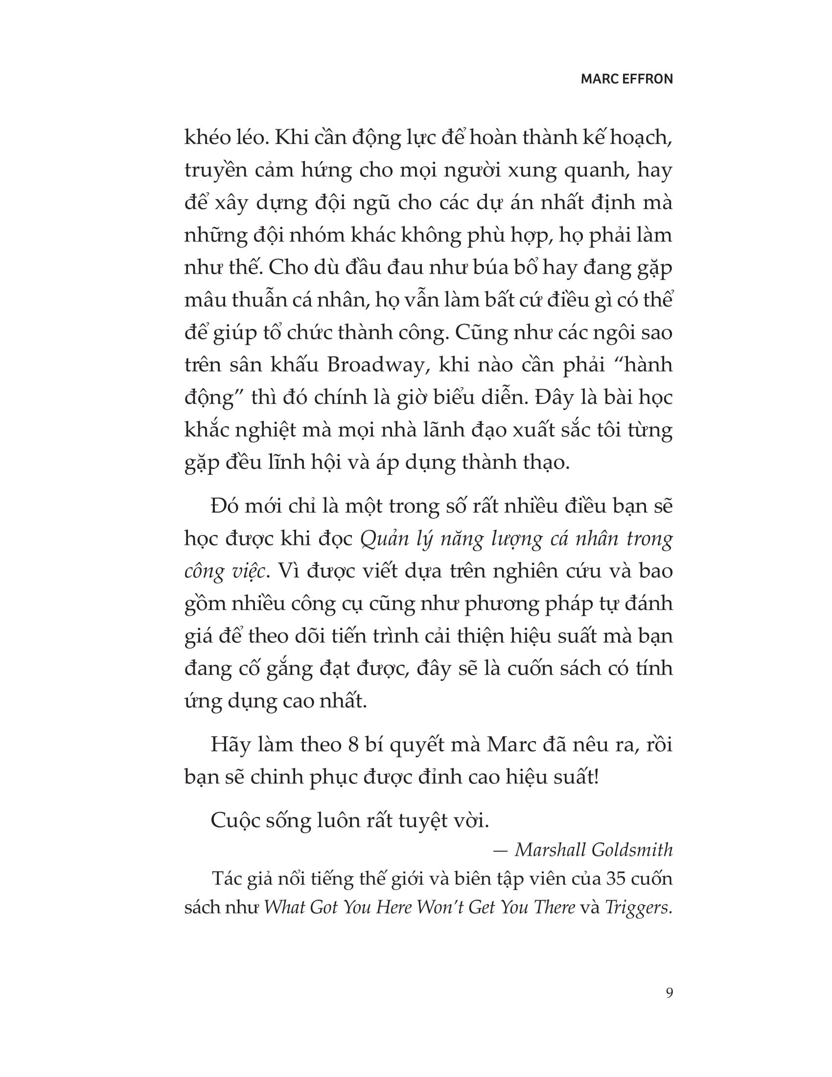Trong cuốn sách này, Marc Effron - chuyên gia về quản lý tài năng và tác giả sác bán chạy, với cách tiếp cận đặc trưng vô cùng đơn giản lấy khoa học làm nền tảng, xác định những yếu tố quan trọng nhất và chỉ cho chúng ta thấy làm thế nào để tận dụng tối ưu thời gian và năng lượng cá nhân để cải thiện và đẩy bật hiệu suất. Rõ ràng hiệu suất cao là kết quả cuối cùng từ tổng hợp nhiều yếu tố, và một vài yếu tố trong đó nằm ngoài khả năng kiểm soát hay thay đổi của chúng ta. Effon chỉ ra 8 yếu tố và từ đó khuyến khích chúng ta tạo thành 8 thói quen để kiểm soát và thực hành những phương pháp thực tế và hữu dụng để chúng ta có cải thiện những yếu tố nằm trong khả năng kiểm soát của chúng ta.