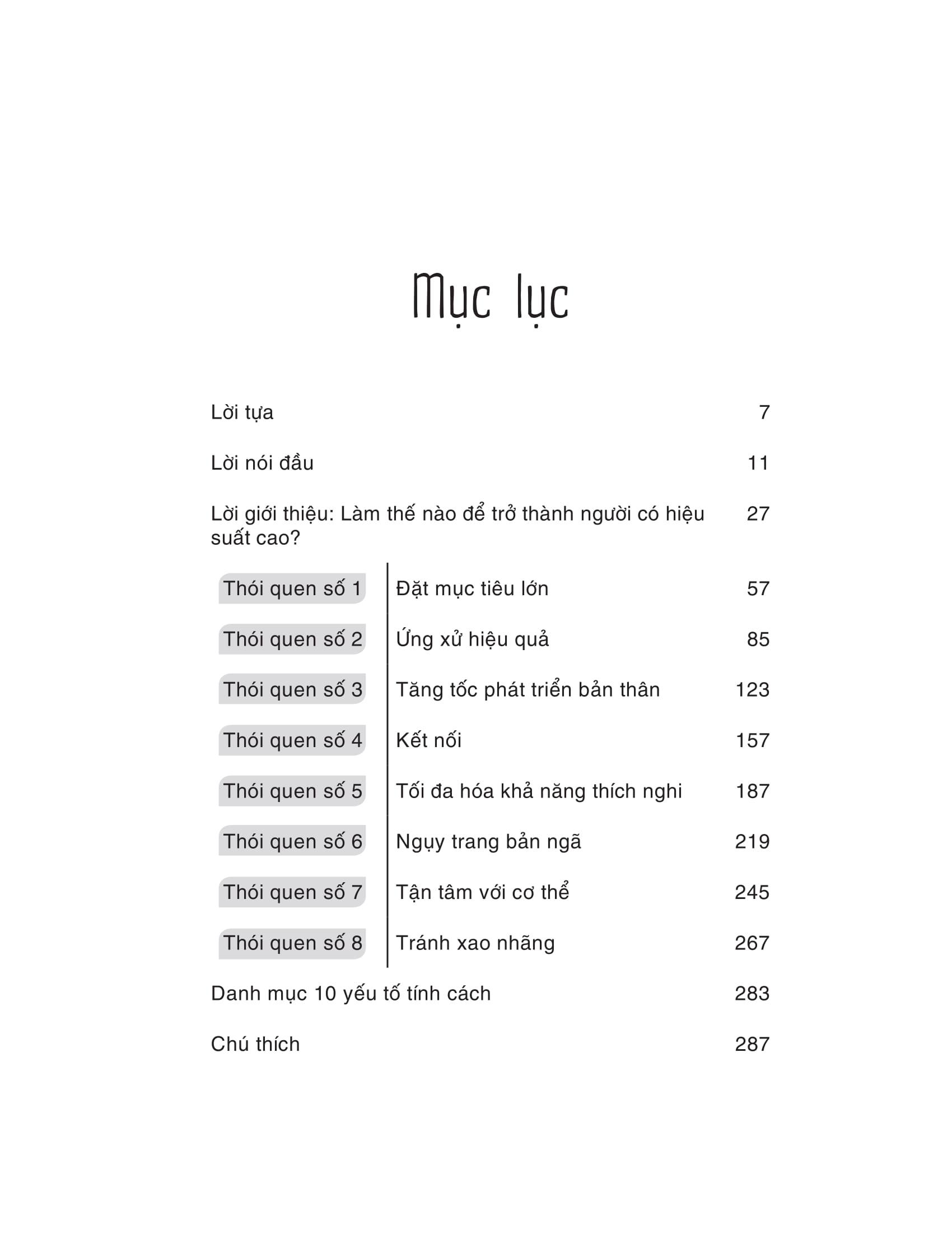 Sau những nỗ lực nghiên cứu như vậy, tác giả đã tổng hợp 8 chủ đề đáp ứng được tiêu chuẩn của ông để đưa vào cuốn sách. Nói một cách ngắn gọn, 8 thói quen đó là: