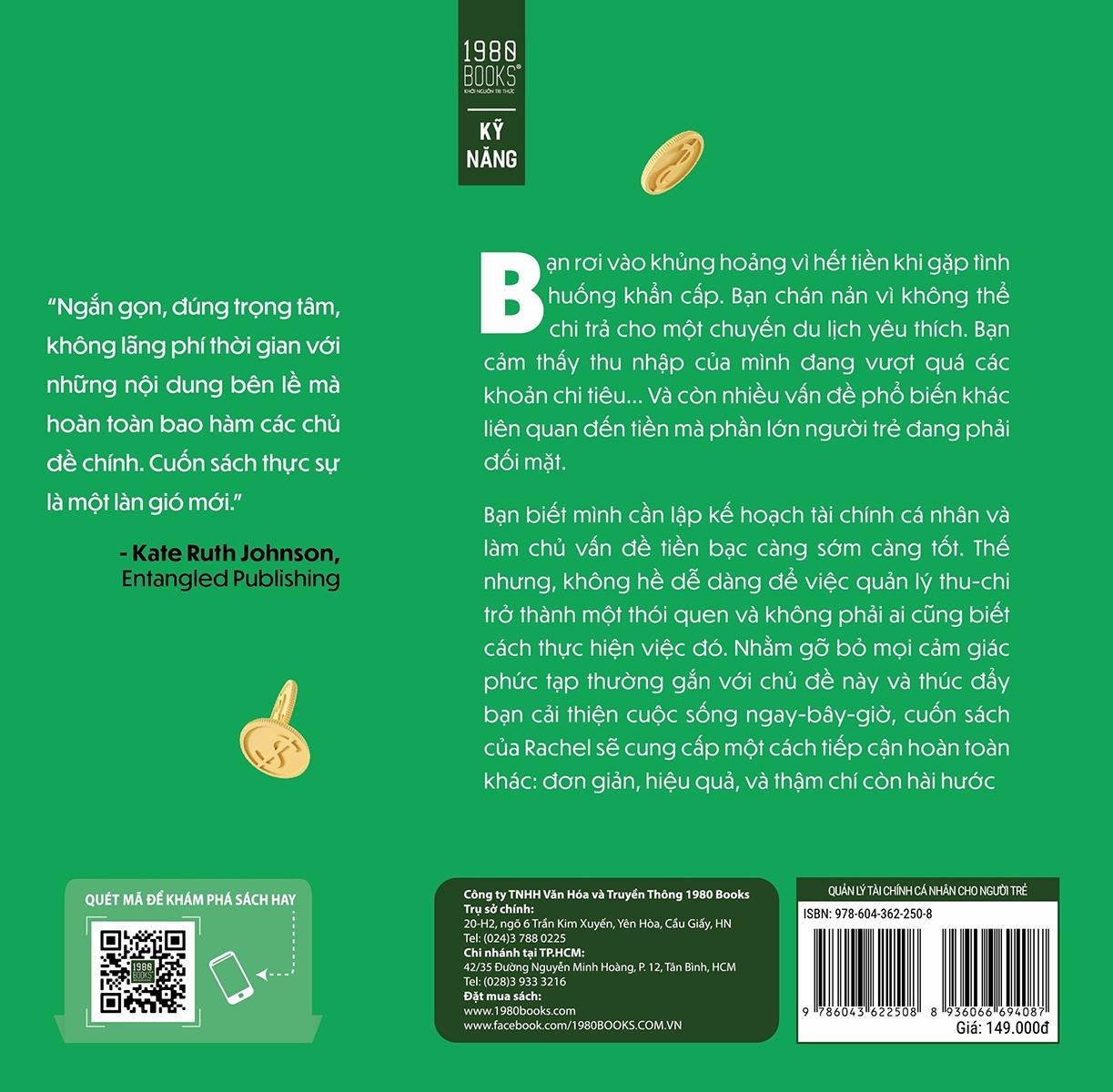 Quản Lý Tài Chính Cá Nhân Cho Người Trẻ Trưởng thành là hành trình vô cùng khó khăn, đặc biệt là khi nói đến việc quản lý tài chính… Và nhiều người trẻ với những bước chân đầu tiên trên hành trình này có thể rơi vào tình trạng “cháy túi”. Đó là tình huống khủng hoảng vì hết tiền khi có việc khẩn cấp. Đó là cảm giác chán nản vì không thể chi trả cho một chuyến du lịch yêu thích. Đó là sự bế tắc khi cảm thấy thu nhập của mình đang vượt quá các khoản chi tiêu nhưng chưa thể tìm được công việc lương cao hơ Và còn nhiều những tình huống, những vấn đề khác liên quan đến tiền mà phần lớn người trẻ đang phải đối mặt. Chúng ta biết cần phải lập kế hoạch tài chính cá nhân và làm chủ vấn đề tiền bạc càng sớm càng tốt. Thế nhưng, không hề dễ dàng để việc quản lý thu-chi trở thành một thói quen và không phải ai cũng biết cách thực hiện việc đó. Nhằm gỡ bỏ mọi cảm giác phức tạp thường gắn với chủ đề này và giúp cải thiện cuộc sống ngay-bây-giờ, cuốn sách của Rachel sẽ cung cấp một cách tiếp cận hoàn toàn khác: đơn giản, hiệu quả, và thậm chí còn hài hước. Vậy làm thế nào mà một cuốn sách có thể thay đổi cách chúng ta nghĩ về tiền cơ chứ? Làm thế nào chúng ta có thể dễ dang thực hành những việc chúng ta biết phải làm nhưng chưa từng làm, như lập ngân sách, cắt giảm nợ, hay đầu tư vào thị trường chứng khoán? Làm thế nào có thể học về tài chính mà hai mắt không muốn nhắm tịt vào đây? Trong cuốn sách này, Rachel Richards, một cựu chuyên viên tư vấn tài chính sẽ giúp chúng ta đạt được những điều tưởng chừng vô cùng khó khăn đó bằng sự hài hước dí dỏm độc nhất của mình. Chủ đề đáng sợ, tài chính cá nhân trở nên dễ dàng hơn bao giờ hết. Từ góc nhìn của một nhà đầu tư và một chủ doanh nghiệp, Rachel đi thẳng vào việc làm thế nào để đạt được sự tự do tài chính. Trong cuốn sách này, bạn sẽ được hướng dẫn để: