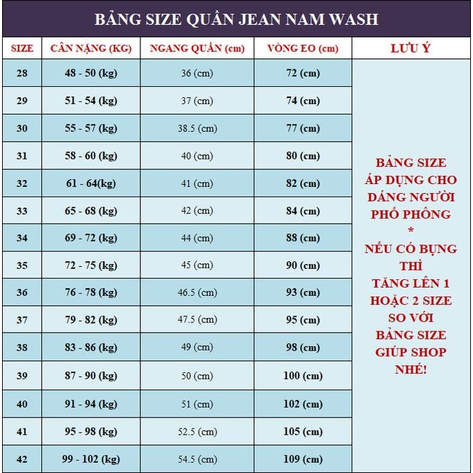 Bảng size (vải co giãn thoải mái nên bạn có thể chọn theo bảng size để phù hợp với nhu cầu mặc bó hoặc thoải mái): 28: Dưới 54 kg (Vòng 2 85cm, Vòng 3