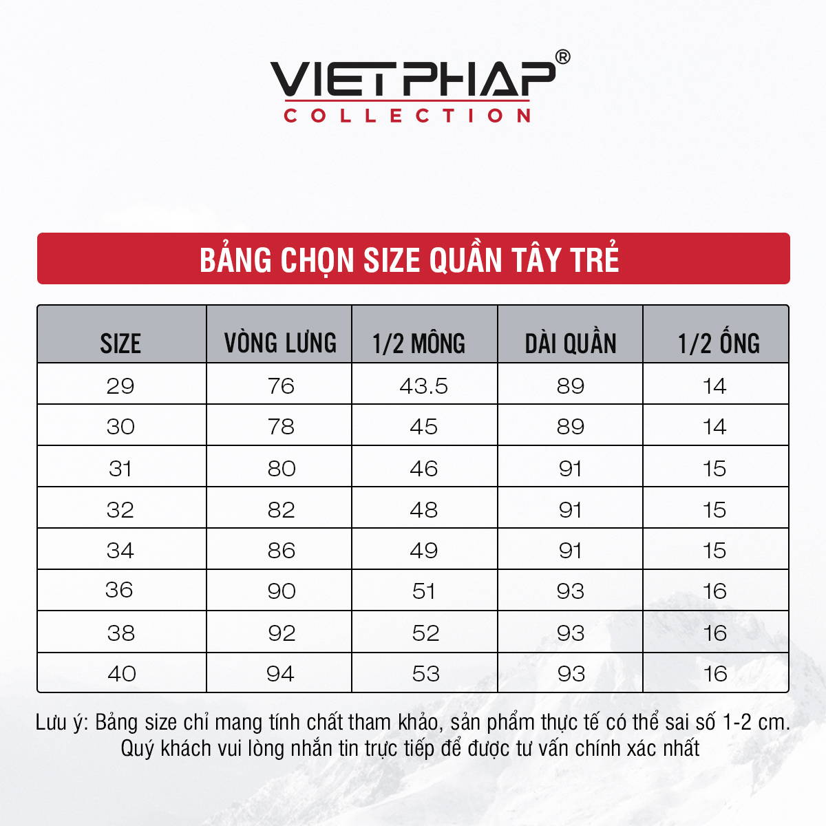 - Đổi trả hàng theo đúng quy định của Tiki VietPhap Collection Sản xuất tại: CTY TNHH May Mặc – Thời Trang Việt Pháp Cùng bạn làm nên phong cách! LƯU Ý: - Bảng size chart chỉ mang tính chất tham khảo, tùy thuộc vào số đo cơ thể mỗi người và chất liệu vải khác nhau sẽ có sự chênh lệch nhất định từ 1 - 2cm.
