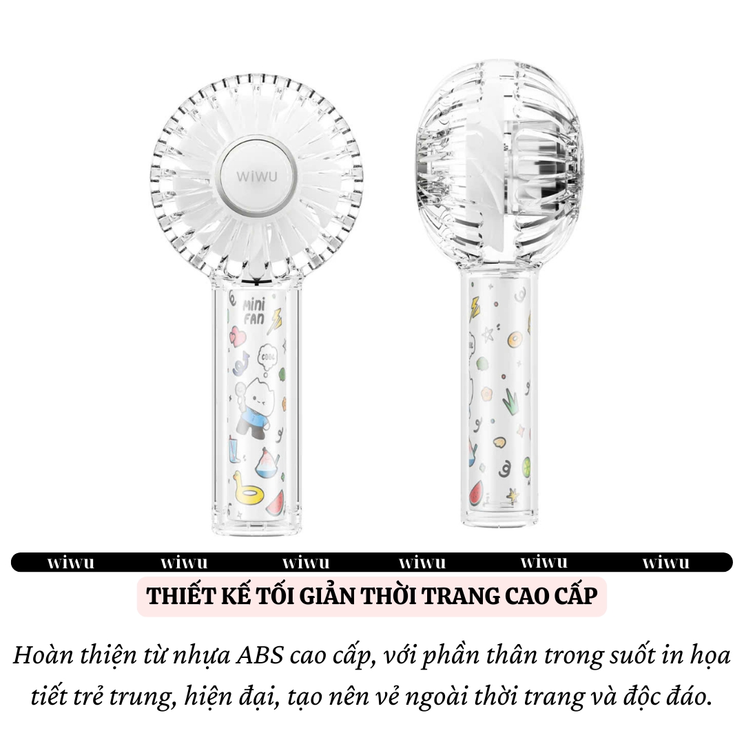 ️ WlWU Mini Fan Wi-FS012 – Quạt Cầm Tay Cao Cấp Dành Cho Phong Cách Sống Di Động Mát lạnh tức thì – Nhỏ gọn – Thời thượng THIẾT KẾ ĐẲNG CẤP, NHẸ NHÀNG VÀ DI ĐỘNG WlWU Mini Fan Wi-FS012 mang phong cách thiết kế tối giản, tinh tế, đúng chuẩn của một thương hiệu phụ kiện công nghệ quốc tế. Sản phẩm được hoàn thiện từ nhựa ABS cao cấp, với phần thân trong suốt in họa tiết trẻ trung, hiện đại, tạo nên vẻ ngoài thời trang và độc đáo. Kích thước nhỏ gọn, dễ dàng bỏ túi hoặc mang theo bên mình, lý tưởng cho người dùng thường xuyên di chuyển, đi công tác, hoặc sử dụng ngoài trời. SỨC GIÓ MẠNH MẼ TRONG THÂN HÌNH NHỎ GỌN Đừng để vẻ ngoài nhỏ bé đánh lừa bạn — Wi-FS012 được trang bị động cơ tốc độ cao cùng thiết kế cánh quạt tối ưu khí động học, giúp tạo ra luồng gió mạnh mẽ nhưng vẫn êm ái. Phù hợp cho cả sử dụng trong phòng làm việc, khi đi bộ ngoài trời, hoặc trong các hoạt động dã ngoại. PIN LÂU – SẠC NHANH – LINH HOẠT TRONG MỌI HOÀN CẢNH Với dung lượng pin 1200mAh, WlWU Mini Fan Wi-FS012 mang lại thời gian sử dụng liên tục lên tới 6 giờ (tuỳ cấp độ gió), giúp bạn yên tâm làm mát suốt cả ngày dài. Quạt hỗ trợ sạc nhanh qua cổng USB, có thể sạc dễ dàng bằng laptop, sạc dự phòng hoặc củ sạc điện thoại thông thường – cực kỳ tiện lợi và linh hoạt trong mọi tình huống. ️ CHẤT LƯỢNG BẢO CHỨNG TỪ WlWU – THƯƠNG HIỆU TOÀN CẦU WlWU – thương hiệu công nghệ đến từ Trung Quốc với hàng loạt phụ kiện nổi tiếng toàn cầu – luôn đặt tiêu chuẩn chất lượng lên hàng đầu. Quạt Wi-FS012 được bảo hành chính hãng 6 tháng (1 đổi 1), cam kết sản phẩm không chỉ đẹp mà còn bền bỉ theo thời gian. THÔNG SỐ KỸ THUẬT NỔI BẬT