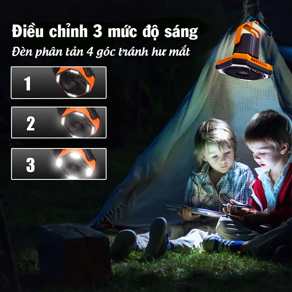 - Thời gian sử dụng 2-8h (tùy chế độ mạnh yếu) Bộ sản phẩm gồm: Quạt tích hợp, remote, HDSD, dây cáp USB to USB Type C dài 30cm ƯU ĐIỂM ️ Quạt di động: sử dụng quạt ở bất kỳ đâu mà không cần phải kết nối với nguồn điện trực tiếp hoặc trong trường hợp bị mất điện ️ Đèn: chiếu sáng trong những trường hợp mất điện, thêm vào đó đèn ở 4 góc còn giúp bảo vệ mắt, tránh cận thị ️ Cổng USB: Cắm sạc điện thoại, máy tính bảng, ️ Nút nháy đèn SOS: Dùng trong trường hợp khẩn cấp, đèn nháy liên tục để báo hiệu ️ Remote điều khiển từ xa: dễ dàng điều chỉnh ️ Tay cầm, móc treo: phù hợp để cầm theo mang đi cắm trại, dã ngoại, treo lều, chiếu sáng và quạt để nướng thịt buổi tối