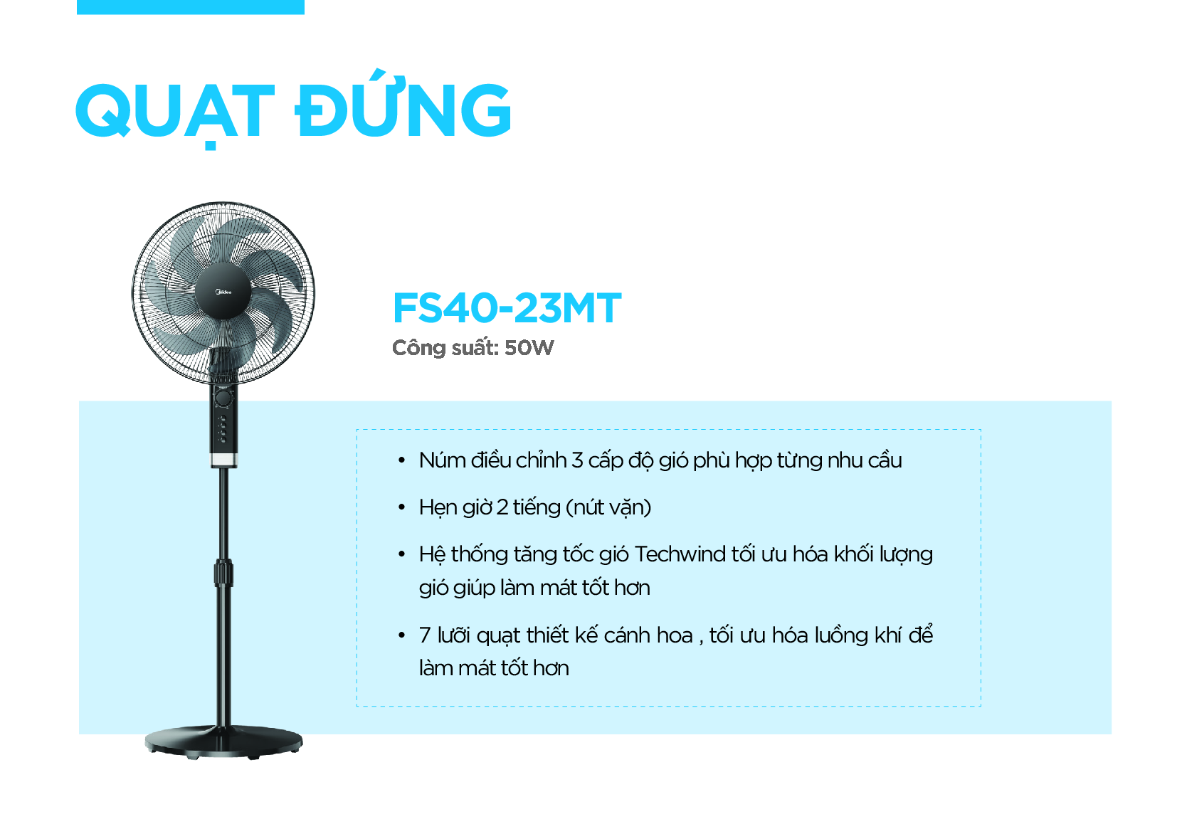 ✨Quạt Đứng 7 Cánh Midea FS40-23MT (Hàng Chính Hãng, Công Suất 50W, Chỉnh Gió 3 Tốc Độ, Có Chức Năng Hẹn Giờ)