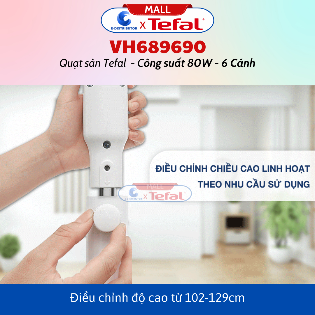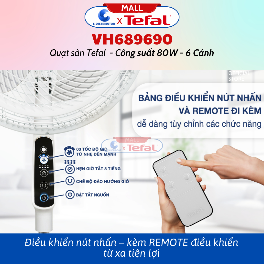 THÔNG TIN SẢN PHẨM: Thương hiệu: Tefal Model: VH679690 Số Cánh Quạt: 06 cánh Chế Độ Gió: Gió thường Tốc Độ Gió: 3 tốc độ gió Lưu Lượng Gió: 100 m3/ phút Hẹn Giờ: Có