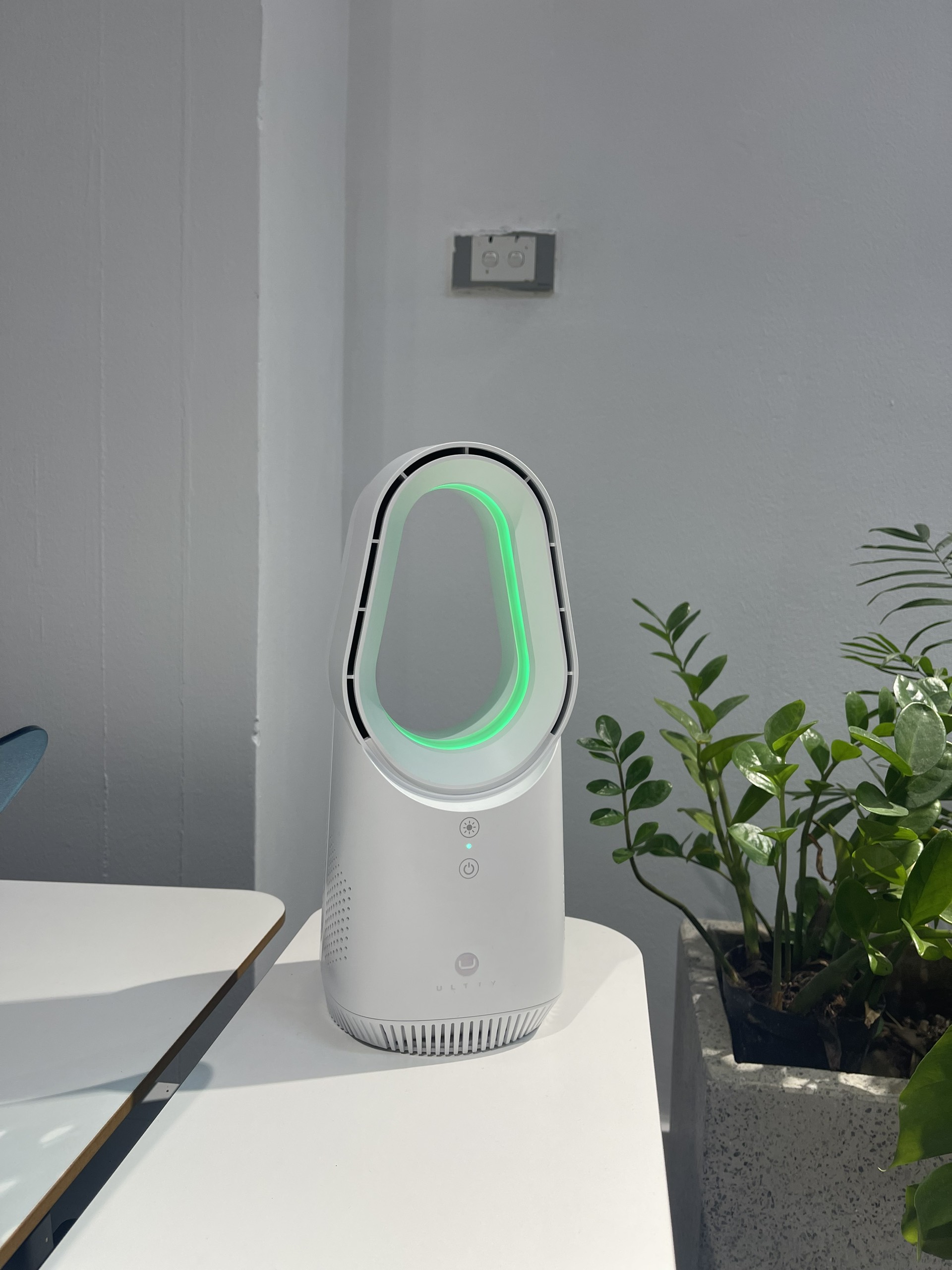 1. Giới Thiệu tổng quan quạt không cánh ULTTY PETIT LIDI - Thiết kế mini, sang trọng với viền bạc kết hợp màu trắng tinh khôi. Được tối ưu để phù hợp với bàn làm việc,