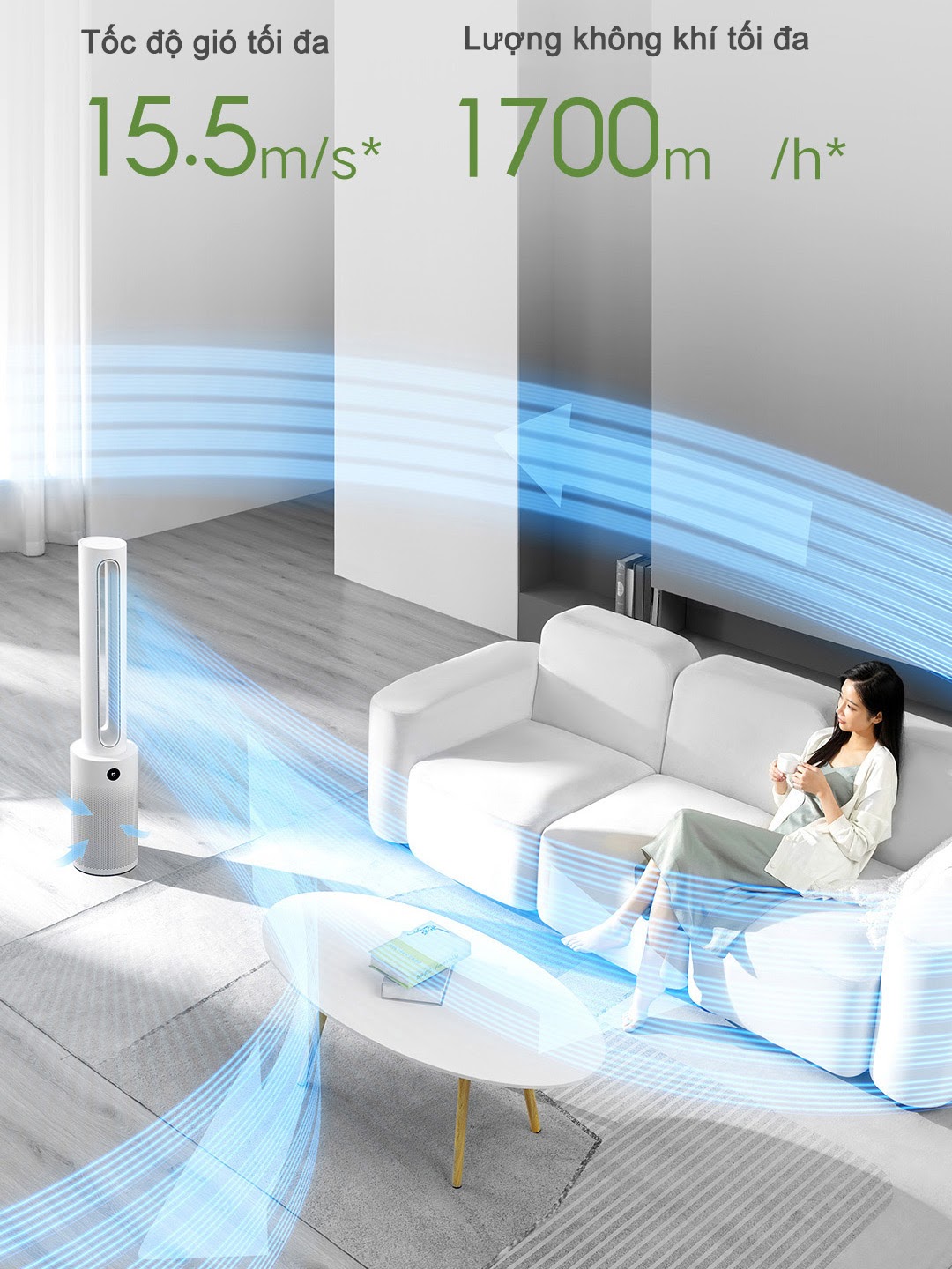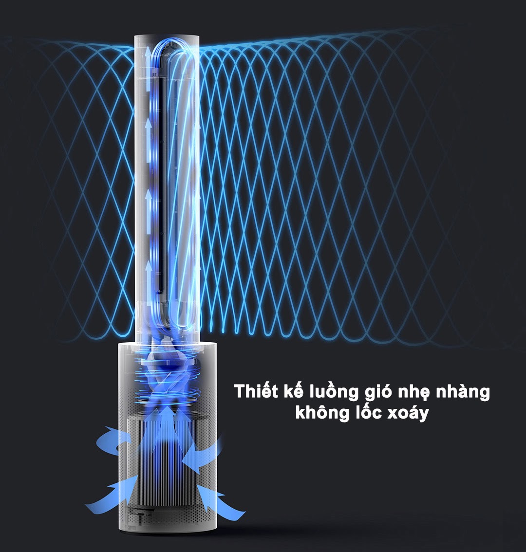 Sử dụng công nghệ Air Multiplier tạo ra luồng không khí mạnh mẽ liên tục. Luồng gió mát mà không cần cánh quạt quay nhanh, an toàn cho trẻ em, vật nuôi. Hoạt động êm