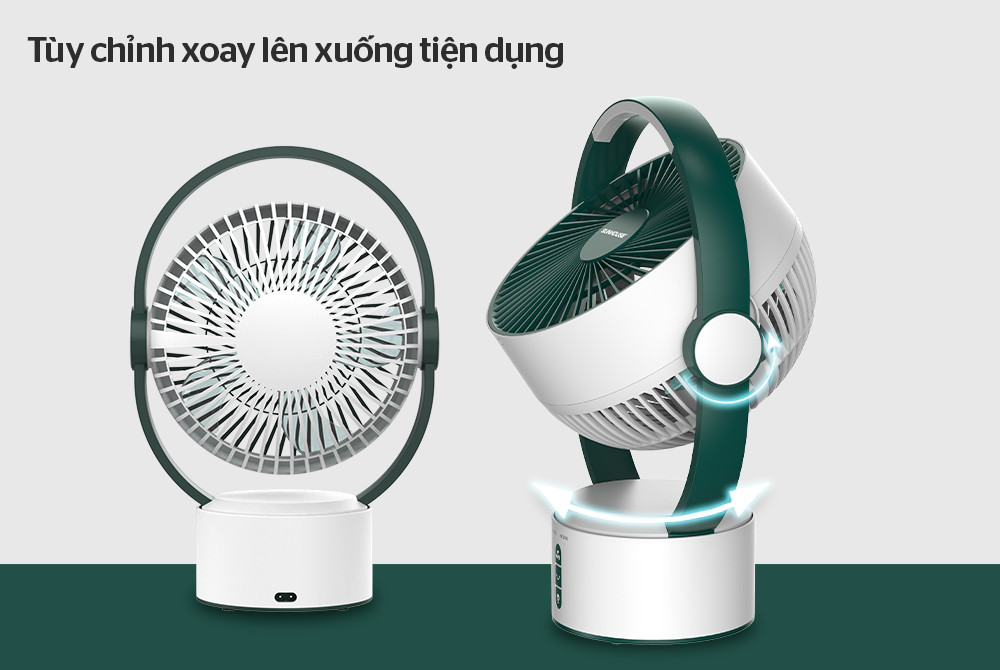 - Tùy chỉnh xoay lên xuống tiện dụng Phần lồng quạt được thiết kế để có thể dễ dàng xoay quay lên trên hoặc chéo xuống thấp quanh trục cố định, nhờ vậy bạn có thể tùy chỉnh hướng gió mà không cần thay đổi vị trí đặt quạt