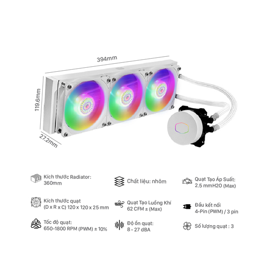Thương hiệu COOLERMASTER Tên sản phẩm ML360L ARGB V2 White Edition Chủng loại Tản nhiệt nước all - in -one Tương thích Tương thích CPU Intel LGA 2066 / 2011-v3 / 2011 / 1151 / 1150 / 1155 / 1156 / 1366 / 775 socket AMD AM4 / AM3+ / AM3 / AM2+ / AM2 / FM2+ / FM2 / FM1 socket Bơm Kích cỡ bơm  79.9 x 76 x 47.1 mm (3.2 x 3.0 x 1.9") Tốc độ bơm   Radiator Kích cỡ Radiator  394 x 119 x 27.2mm (15.5 x 4.7 x 1.1") Quạt Kích cỡ quạt (Dx Rx C) 120 x 120 x 25 mm / 4.7 x 4.7 x 1 inch Tốc độ quạt 650-1800 RPM ± 10% Độ ồn quạt 8 - 27 dBA Màu quạt Trắng Màu & chế độ LED ARGB Tính năng nổi bật Tính năng nổi bật Thiết kế pump lồng hơi kép thế hệ mới. Bề mặt tiếp xúc lớn trên két nước Quạt SickleFlow 120 ARGB mới Gia cố bọc dây chống rỉ nước Đồ ồn thấp < 15dBA giúp tản nhiệt hoạt động êm ái hơn Shop xin cam kết với hàng bán:  Shop hỗ trợ miễn phí 1 lượt ship (Từ Cần Thơ đến người mua) gửi trả bảo hành nếu sản phẩm bị lỗi trong 1 tháng đầu tiên.  Đúng thông số kỹ thuật, bao đổi trả hoàn tiền 100% giá trị sản phẩm nếu quý khách không hài lòng về chất lượng sản phẩm sau khi test thử trong vòng 48h!  Hàng mới bảo đảm fullbox mới 100%. Sản phẩm mới mua về nếu Quý Khách chưa sử dụng được vui lòng liên hệ để Shop hỗ trợ kỹ thuật.