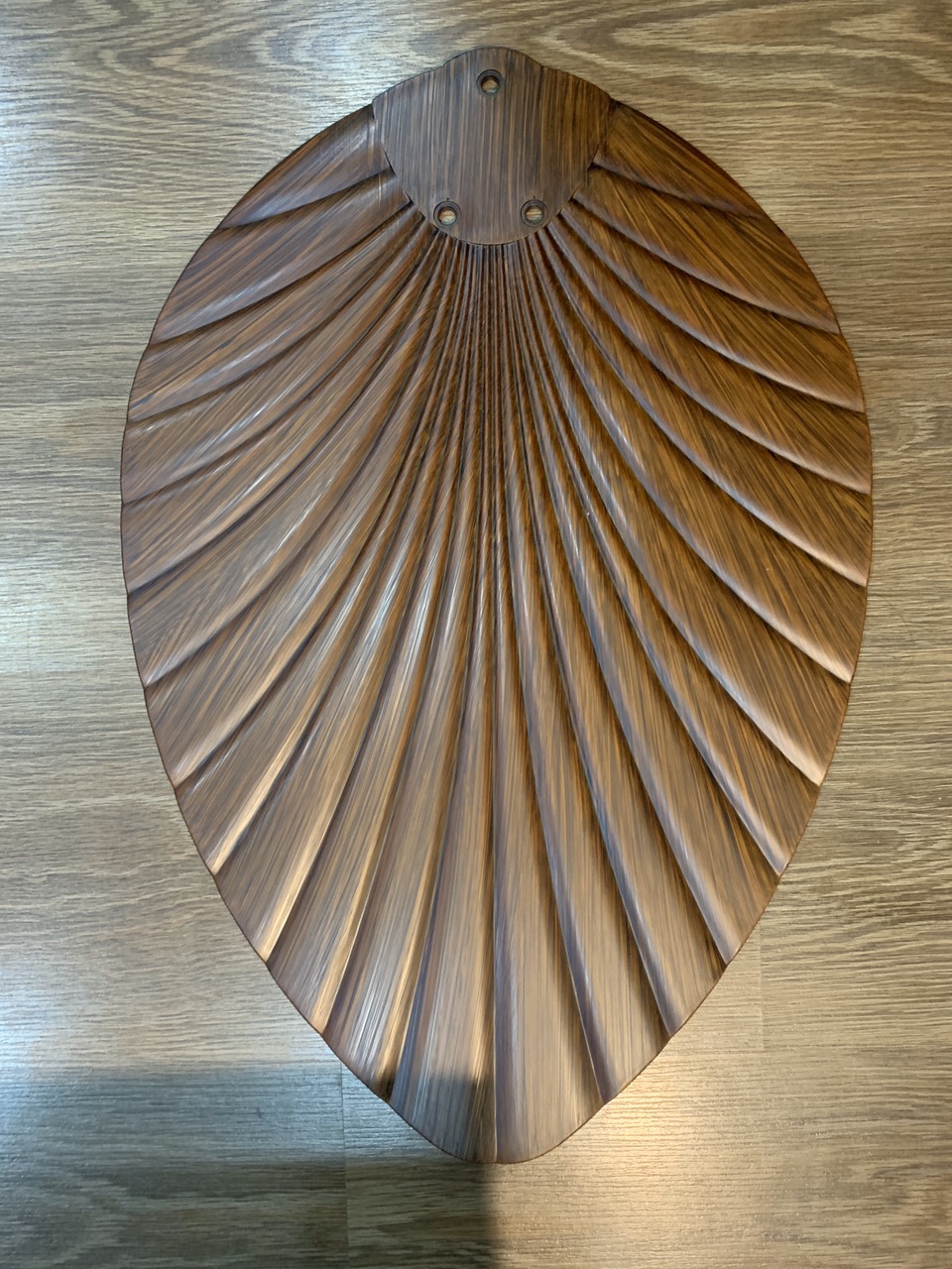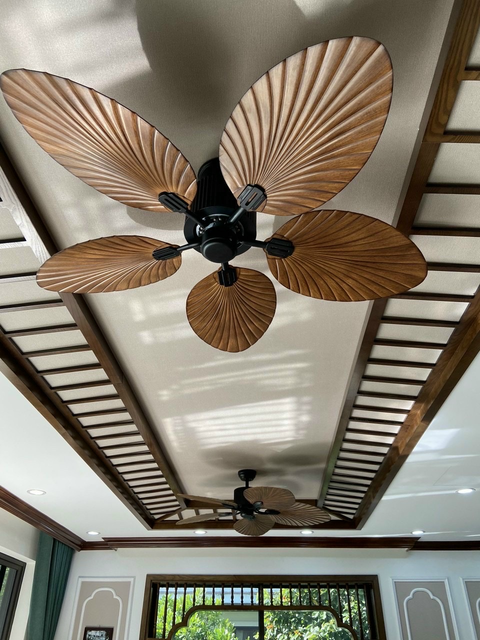 Quạt trần thông minh được thiết kế mới lạ và độc đáo với những chiếc cánh hình lá cây, hơn nữa lá cây màu nâu gỗ tạo cảm giác cổ điển và trang nhã.