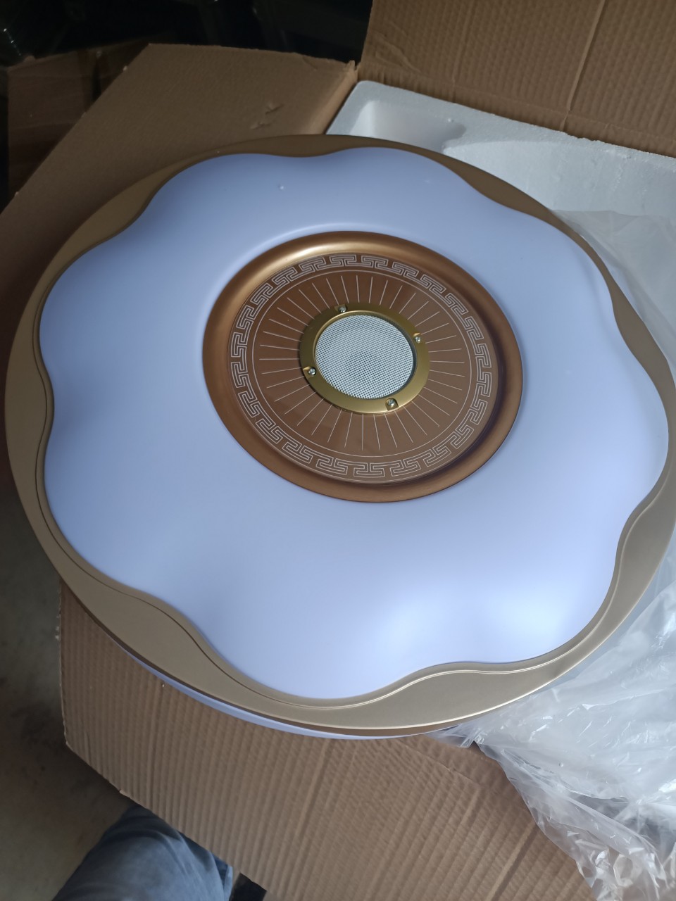 - Chất liệu cánh : Acrylic trong suốt Đèn_quạt_trần là sự kết hợp hoàn hảo và linh hoạt giữa đèn_trần và quạt_trần và loa nghe nhạc. Là sản phẩm 3 trong 1 tiết kiệm được không gian bày trí và tạo tính thẩm mỹ cao cho không gian phòng khách, phòng hội nghị