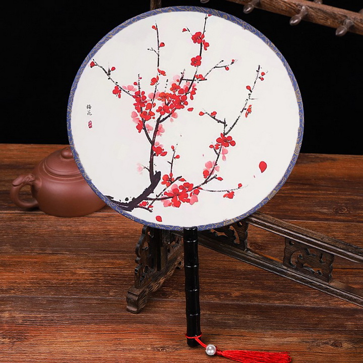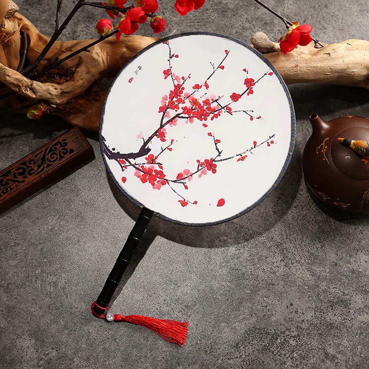 Quạt tròn cổ trang hoa mai đỏ loại nhỏ đường kính 21cm