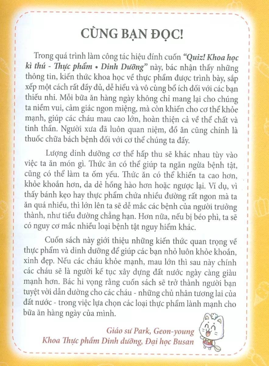 “Trong quá trình làm công tác hiệu đính cuốn “Quiz! Khoa học kì thú - Thực phẩm • Dinh Dưỡng” này, bác nhận thấy những thông tin, kiến thức khoa học về thực phẩm được trình bày, sắp xếp một cách rất đầy đủ, dễ hiểu và vô cùng bổ ích đối với các bạn thiếu nhi. Mỗi bữa ăn hàng ngày không chỉ mang lại cho chúng ta niềm vui, cảm giác ngon miệng, mà còn khiến cho cơ thể khỏe mạnh, giúp các cháu mau cao lớn, hoàn thiện cả về thể chất và tinh thần. Người xưa đã luôn quan niệm, đồ ăn cũng chính là thuốc chữa bách bệnh đối với cơ thể chúng ta đấy.