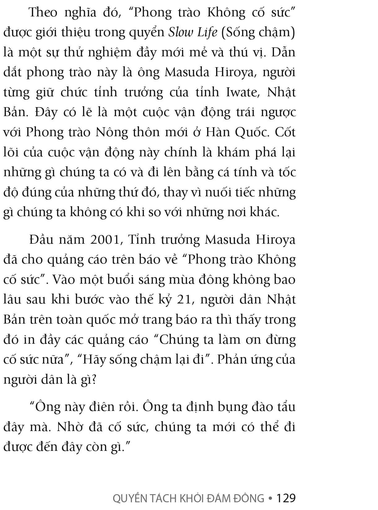 Không giống như hầu hết những cuốn sách self-help khác, “Quyền tách khỏi đám đông” không thôi thúc độc giả phải mạnh mẽ vượt lên nghịch cảnh để tiếp tục tiến về phía trước, mà khích lệ bạn “không làm gì” để tận hưởng cuộc sống; không răn dạy bạn phải cống hiến cho công việc đến mức kiệt sức, mà khuyên bạn nên dành nhiều thời gian hơn để nuôi dưỡng nội tâm và khám phá những điều đẹp đẽ trong cuộc sống hằng ngày.