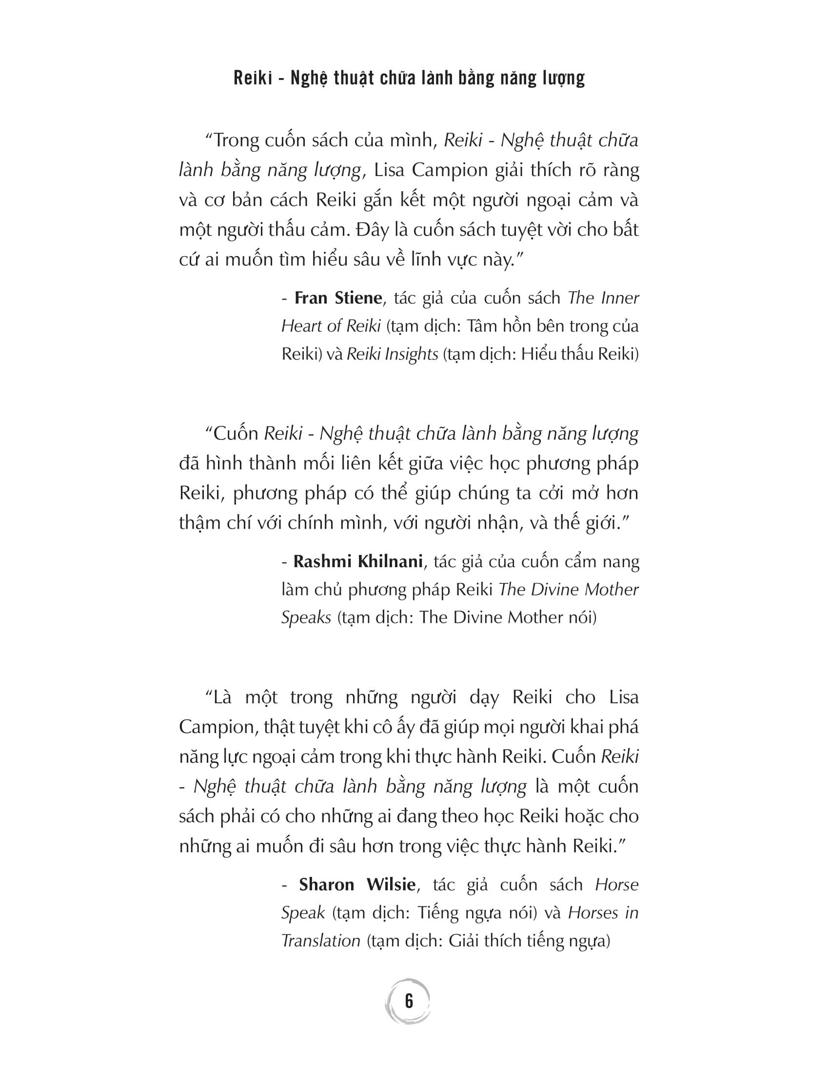 Reiki – Nghệ thuật chữa lành bằng năng lượng sẽ giúp chúng ta hợp nhất năng lực thấu cảm, năng lực ngoại cảm và năng lực chữa lành một cách lành mạnh. Xuyên suốt cuốn sách này, sẽ có nhiều bài tập và bài thiền đa dạng, giúp các bạn khám phá những nguyên tắc của Reiki cũng như tiếp tục nâng cao hiểu biết và khả năng thực hành Reiki của mình.