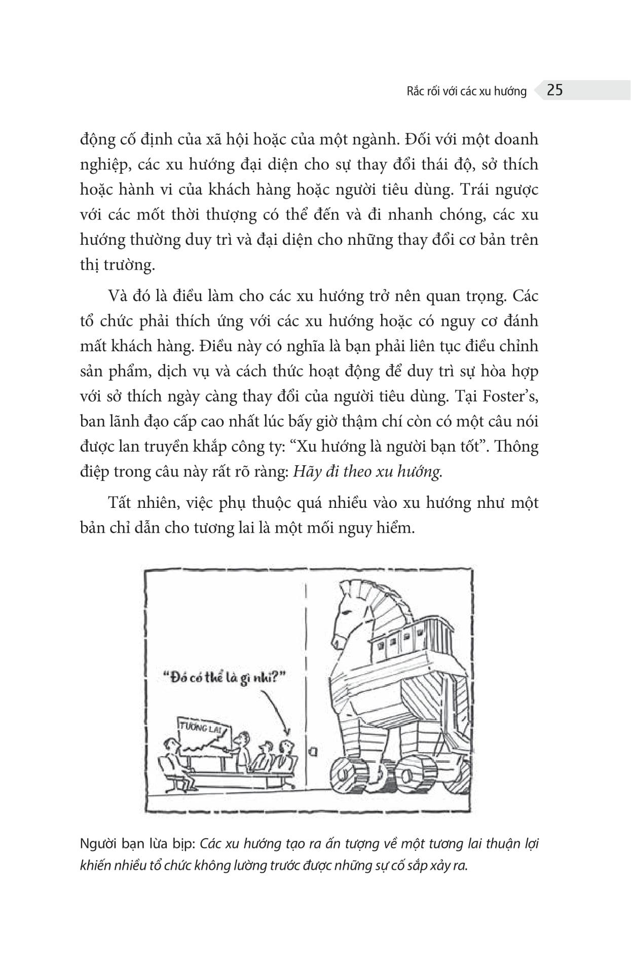 RETHINKING STRATEGY - TƯ DUY LẠI CHIẾN LƯỢC Bí quyết làm chủ sự thay đổi và đưa ra quyết định tối ưu Làm thế nào để doanh nghiệp đương đầu với những thách thức? Việc không thể thấy trước và thích ứng với những thay đổi đáng kể trong môi trường kinh doanh là nguyên nhân gây ra sự bất an và bức bối khủng khiếp của các nhà quản lý, hội đồng quản trị và các nhà đầu tư, điều này dẫn đến việc nhiều công ty đã phải ngừng hoạt động và đóng cửa. Lý do mấu chốt là các doanh nghiệp đã thất bại trong quy trình xây dựng chiến lược và đổi mới sáng tạo khi không thể bắt kịp thị trường ngày càng biến động và sự đòi hỏi của môi trường kinh doanh. Khi biết rằng những gì mình đề xuất không tạo sự khác biệt nào, các nhà quản lý buộc lòng quay lại với các quy trình chiến lược cũ thiếu hiệu quả mà họ vốn quen thuộc nhưng chẳng còn mấy tin tưởng. Kết quả là, họ ngày càng dễ bị tấn công trước những biến động bất ngờ và ngày càng cảm thấy mất quyền kiểm soát khi những bất ngờ ấy ảnh hưởng đến tương lai mà họ muốn đến. Rethinking Strategy - Tư Duy Lại Chiến Lược mang đến sự phát triển doanh nghiệp Khi sự biến động và bất định dần trở nên bình thường trong kinh doanh, các nhà quản lý tìm kiếm một cách tiếp cận mới để đưa công ty của họ phát triển; một quy trình được thiết kế đặc biệt để nắm bắt cơ hội từ sự không chắc chắn; một quy trình có thể tạo ra tầm nhìn chiến lược khác biệt; một quy trình huy động sức sáng tạo và năng lực kinh doanh trong nội bộ tổ chức. Và việc tạo ra các quy trình đó chính là mục tiêu của quyển sách Rethinking Strategy - Tư Duy Lại Chiến Lược. Rethinking Strategy - Tư Duy Lại Chiến Lược cung cấp cho các tổ chức một quy trình đổi mới sáng tạo để phát triển chiến lược dành cho sự biến động và bất định ngày nay. Một quy trình như vậy sẽ tái định hình chiến lược như một nguồn lực và xem việc thiết kế chiến lược như một hoạt động học tập và sáng tạo chính của doanh nghiệp. Tư duy lại chiến lược đưa ra một cách tiếp cận toàn diện và thực tế để giải quyết 3 câu hỏi cốt lõi của việc phát triển một chiến lược thành công: “Tiếp theo là gì? Vậy thì sao? Bây giờ thì sao?”. Trọng tâm của quy trình này là nghệ thuật phát triển các kịch bản và đánh giá khả năng dự đoán cũng như tính chuyển đổi của các kịch bản đó. Các kịch bản tạo điều kiện cho nhà quản lý xây dựng những quan điểm chiến lược ban đầu, nhìn nhận lại các môi trường tương lai mà họ có thể phải cạnh tranh dưới góc độ khác, và nhận thức lại vai trò cũng như chức năng của doanh nghiệp trong những bối cảnh tương lai. Quyển sách Rethinking Strategy: How to Anticipate the Future, Slow Down Change, and Improve Decision Making này là hành trình của tác giả Steve Tighe từ vai trò quản lý bộ phận Tâm lý Người tiêu dùng tại Foster’s đến lĩnh vực nghiên cứu về tương lai và tầm nhìn chiến lược, và cuối cùng là lĩnh vực thiết kế chiến lược. Cuốn sách đúc kết kinh nghiệm học tập và thực tiễn mà tác giả đã tích lũy được trong giai đoạn này để đưa ra các phương pháp dự đoán tương lai và một quy trình hoàn chỉnh để phát triển chiến lược. Qua đó, với chủ đề nâng cao năng lực doanh nghiệp, cuốn sách Rethinking Strategy - Tư Duy Lại Chiến Lược chắc chắn sẽ cung cấp những hiểu biết sâu sắc về chiến lược và các công cụ cần thiết để giúp các nhà quản lý xác định được tương lai mà họ mong muốn cho doanh nghiệp.