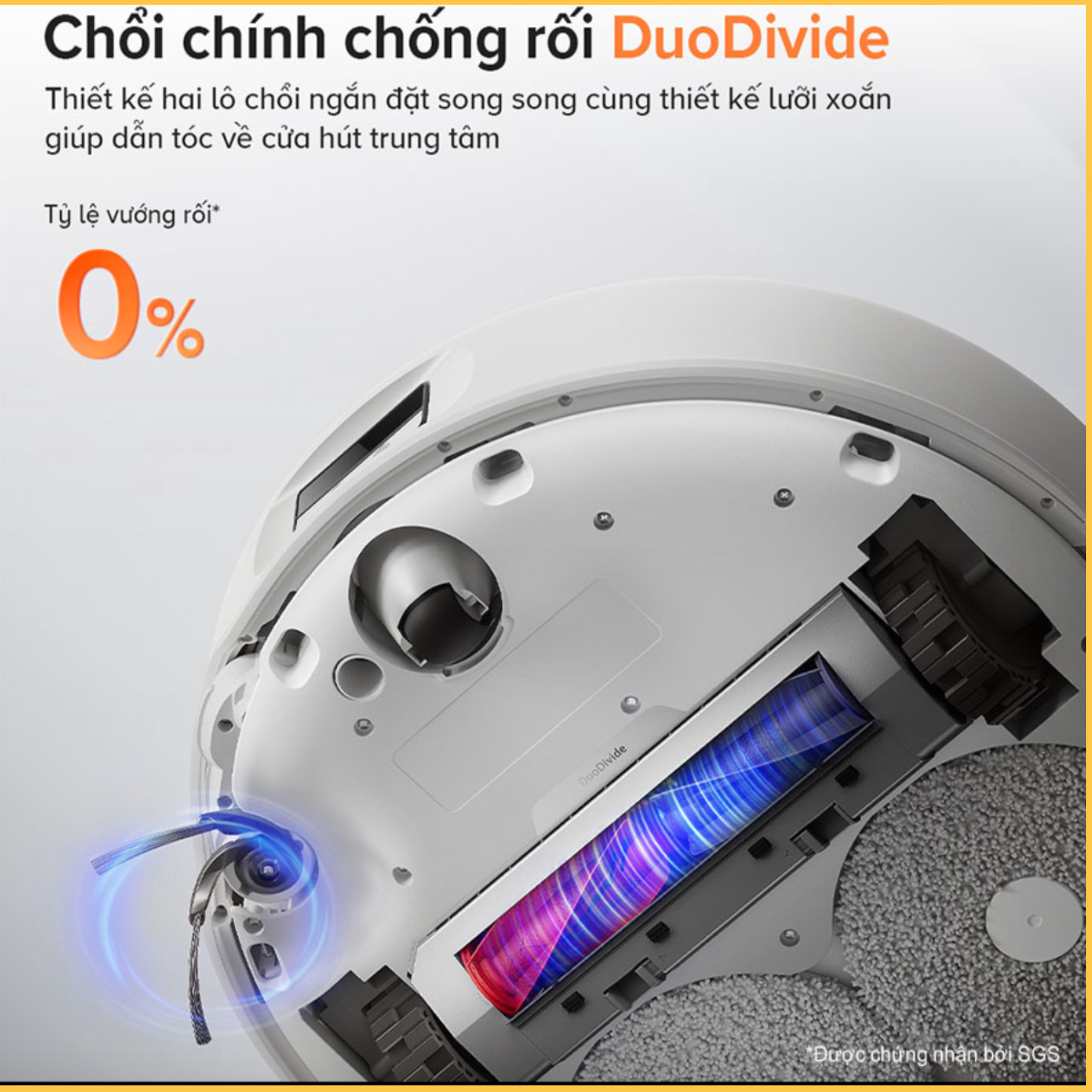 Ưu điểm của robot hút bụi lau nhà Roborock Q Revo Curv - Hệ thống chống rối tóc kép DuoDivide - Công nghệ FlexiArm: Không bỏ sót bất kỳ góc cạnh nào - Khung gầm