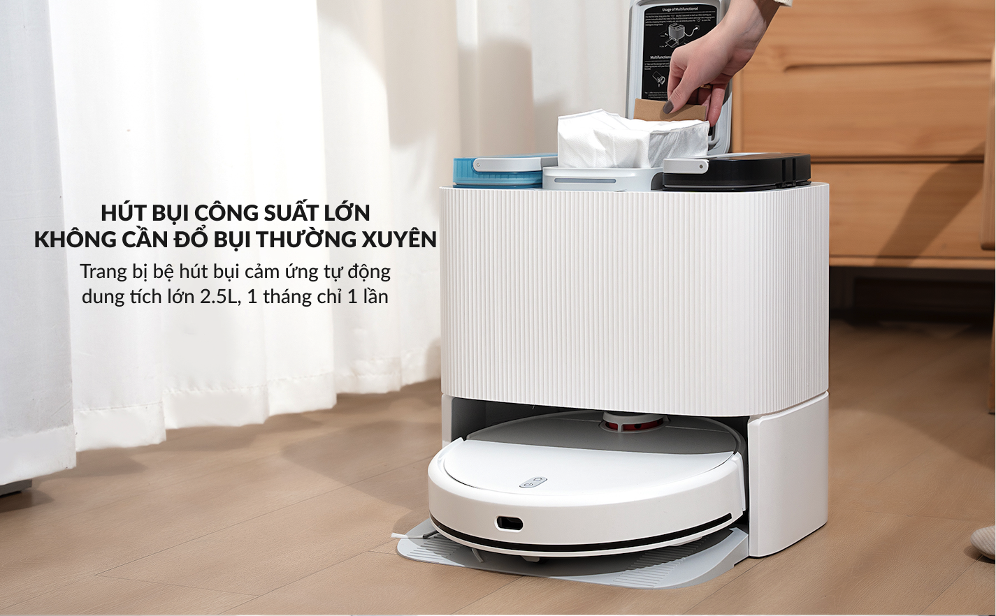 Tích hợp công nghệ Quét laser 3D định vị hệ thống hiển thị bản đồ toàn bộ ngôi nhà. Chốt quét: 2 chiếc Tự động quay về dock sạc, leo dốc 3cm. Thời gian sạc