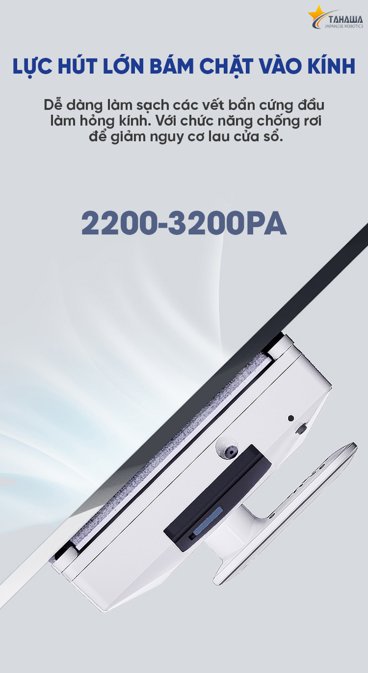 - Di chuyển tổng hợp giúp cho cửa kính nhà bạn không bị bỏ sót điểm nào Ngoài ra, robot còn tích hợp bộ nhớ để tự động quay về vị trí ban đầu sau khi làm việc. Robot Lau Kính Tahawa TH-YW509 - cảm biến chống rơi hiện đại Robot lau kính Tahawa TH-YW509 được trang bị chip điều khiển thông minh và cảm biến gia tốc sáu trục, giúp máy hoạt động hiệu quả. Ngoài ra, hệ thống cảm biến chuyển động khung cửa sổ đảm bảo an toàn và chính xác trong quá trình làm việc. Tốc độ làm sạch nhanh TH-YW509 sở hữu khả năng làm sạch kính nhanh chóng lên tới 2,4 phút trên 1 mét vuông. Từ đó có thể vệ sinh những tấm kính lớn 1 cách nhanh chóng. Robot Lau Kính Tahawa TH-YW509 - Khả năng hút chân không lớn Với khả năng hút chân không 3200pa, robot lau kính Tahawa TH-YW509 có thể chịu tải trọng 6000g theo phương thẳng đứng. Điều này giúp tăng ma sát giữa kính và máy, tránh trượt trên kính ướt và đảm bảo quá trình lau cửa sổ ổn định hơn. Hoạt động được trên nhiều bề mặt kính khác nhau Robot lau kính Tahawa TH-YW509 có thể làm việc được trên nhiều bề mặt kính khác nhau, thậm chí máy còn cho khả năng lau sạch trên bề mặt gạch men ốp tường và đá hoa cương. Robot Lau Kính Tahawa TH-YW509 - Điều khiển bằng remote và app Robot lau kính Tahawa TH-YW509 có thể được điều khiển bằng remote hoặc qua ứng dụng di động. Việc điều khiển dễ dàng và thuận tiện giúp bạn sử dụng máy một cách linh hoạt. Bộ khăn lau đặc biệt liền mảnh Robot lau kính của Tahawa được tích hợp với bộ lau vách siêu sạch, được chế tạo từ chất liệu microfiber đặc biệt. Điều này giúp cho robot Tahawa TH-YW509 có khả năng loại bỏ bụi bám trên tấm kính một cách sạch sẽ và hiệu quả. Bên cạnh đó, Tahawa TH-YW509 còn được trang bị một bộ vỏ hút an toàn và dây buộc, giúp ngăn chặn robot rơi xuống hoặc rơi ra ngoài cửa sổ. Ngay cả khi thiết bị tách ra khỏi kính, bạn cũng không cần phải lo lắng về sự an toàn của nó trong quá trình lau dọn nhà cửa. Bộ Phụ Kiện Chính sách bảo hành, hàng nhập khẩu chính hãng