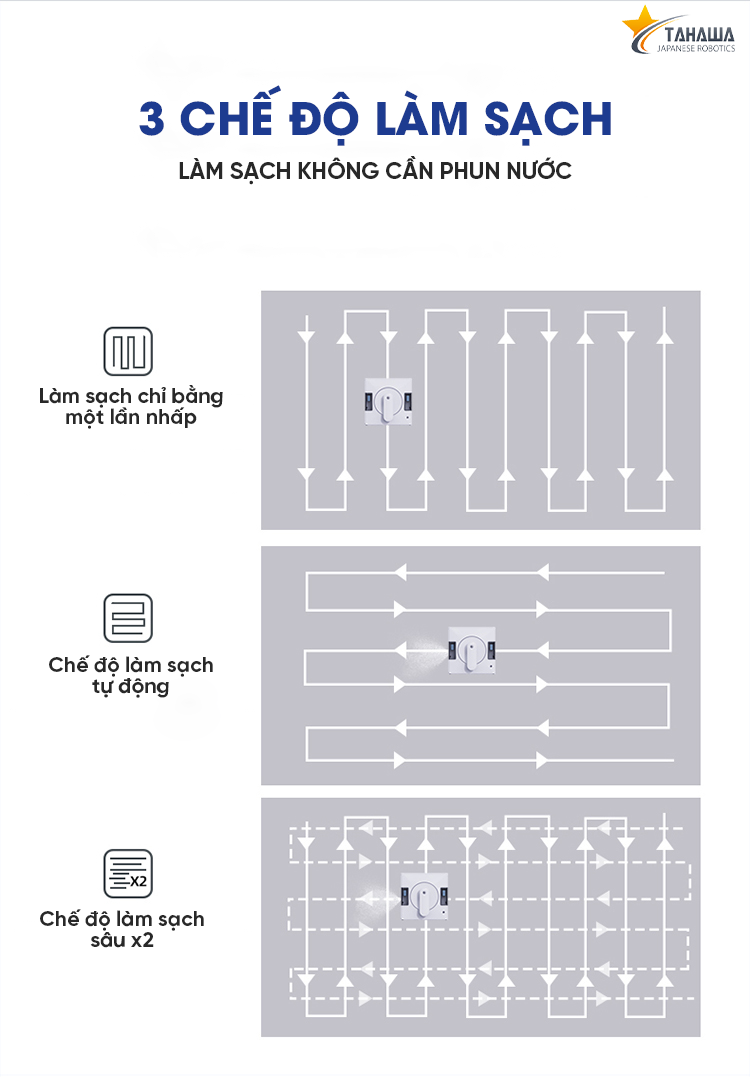- Nhắc nhở bằng giọng nói Tính năng độc đáo Robot lau kính Nhật Bản Tahawa TH-YW509 đã chứng tỏ được ưu thế vượt trội với những tính năng độc đáo, hàng nhập khẩu chính hãng Hệ thống làm sạch thông minh với khả năng phun nước 2 chiều với bình chứa nước lớn Tốc độ làm sạch nhanh Nhắc nhở bằng giọng nói Cơ chế làm việc của robot này thật sự đột phá với những tiện ích đặc biệt: Có dây đai an toàn Điều khiển từ xa dễ dàng Thuật toán chống rơi hiện đại Hệ thống làm sạch thông minh với khả năng phun nước 2 chiều với bình chứa nước lớn Sự khác biệt lớn nhất của Robot Lau Kính Tahawa TH-YW509 so với các dòng khác trên thị trường là khả năng phun nước 2 chiều giúp robot làm sạch kính 1 cách nhanh chóng. Robot Lau Kính Tahawa TH-YW509 - Lập kế hoạch lộ trình thông minh Robot lau kính Tahawa TH-YW509 có khả năng tự động lập kế hoạch lộ trình làm sạch thông minh. Với 3 chế độ di chuyển làm sạch thông minh khác nhau, robot sẽ giúp làm sạch tấm kính nhà theo nhu cầu của bạn: Robot lau kính Tahawa TH-YW509 được trang bị trí tuệ nhân tạo để phát hiện và tạo lộ trình thông minh:
