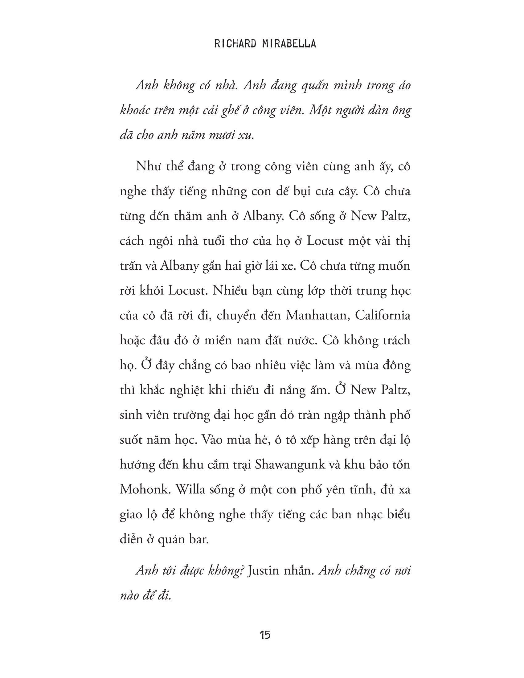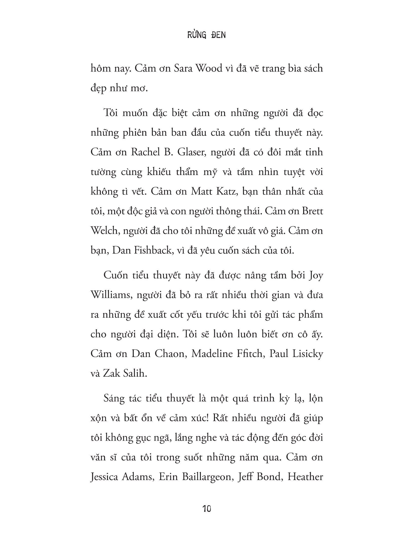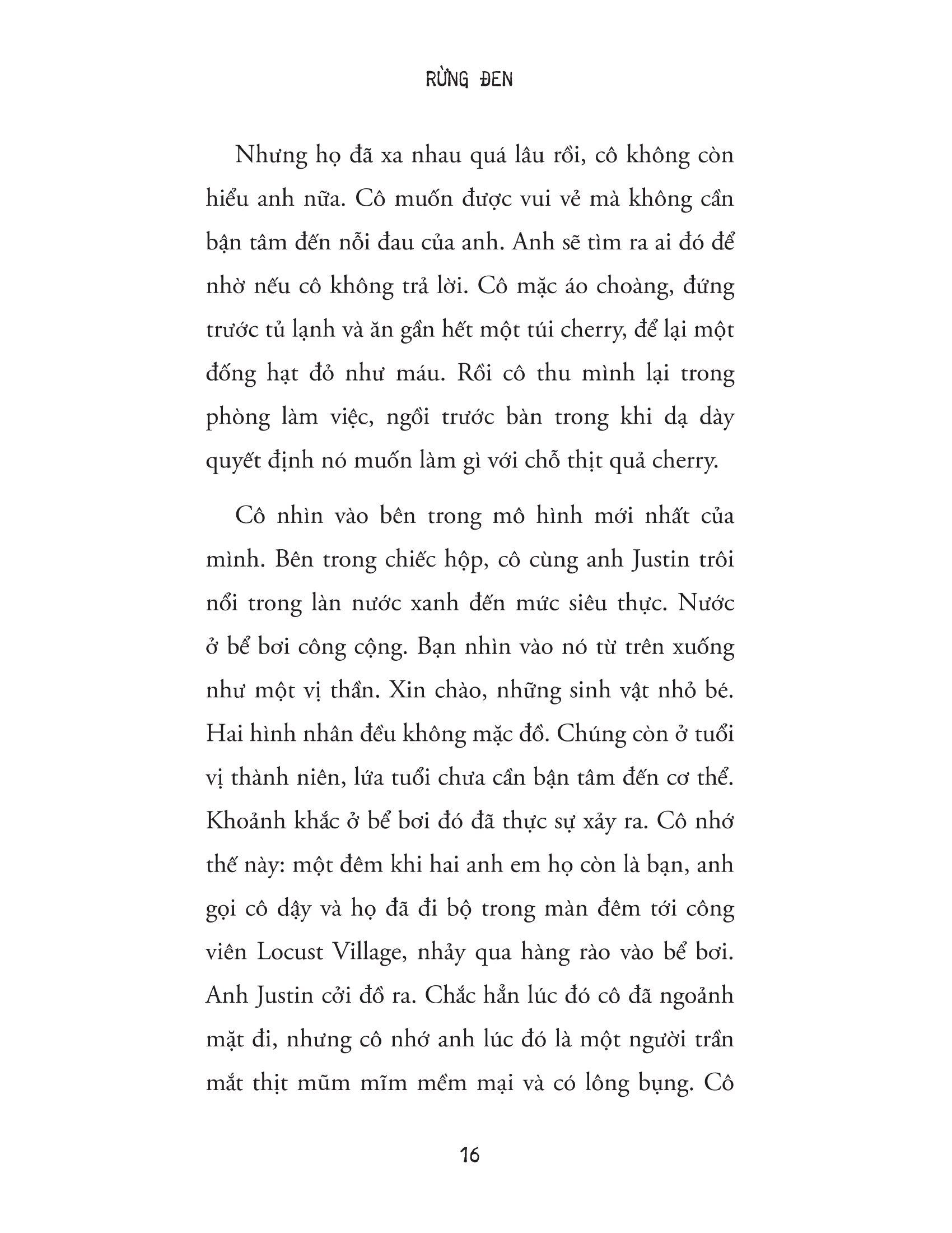 Rừng Đen Sau nhiều năm cắt đứt liên lạc, Justin xuất hiện trước cửa nhà Willa, em gái m.ình và nói cần một nơi để ở. Willa, một cô gái ngăn nắp, cẩn thận, làm y tá và rảnh rỗi thì làm tranh tầm sâu. Mối quan hệ của Willa và Justin luôn căng thẳng nhưng đầy yêu thương. Và liệu mối quan hệ ấy sẽ rẽ đi đâu khi Justin mất kiểm soát, không thể tỉnh táo do những ảnh hưởng kéo dài của chấn thương sọ não do người bạn trai đồng giới gây ra từ nhiều năm về trước. Liệu sự trở về bên gia đình sau bao năm mất tích ấy của Justin, có mang lại cho anh hạnh phúc? Về tác giả: Richard Mirabella là một nhà văn kiêm công chức sống ở ngoại ô New York. Truyện ngắn của ông đã xuất hiện trên Story Magazine, American Short Fiction trực tuyến, One Story, Split Lip Magazine, và nhiều nơi khác. Một số lời đánh giá tích cực: