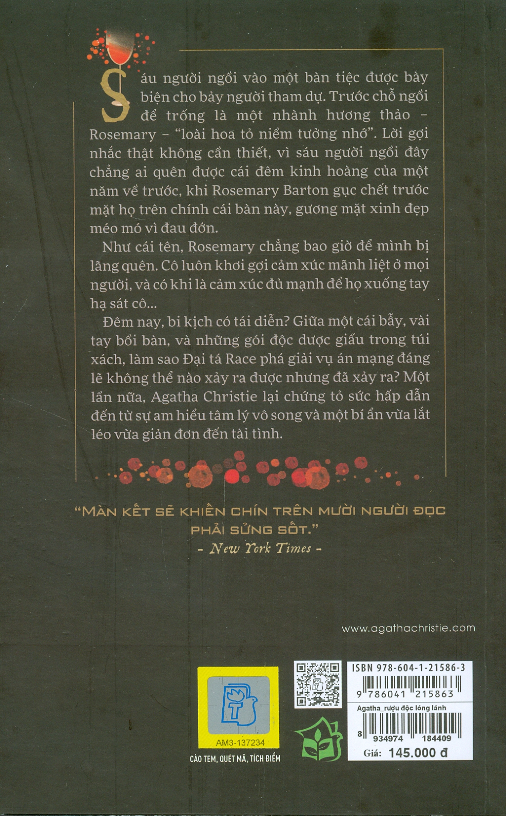 Sáu người ngồi vào một bàn tiệc được bày biện cho bảy người tham dự. Trước chỗ ngồi để trống là một nhành hương thảo – Rosemary – “loài hoa tỏ niềm tưởng nhớ”. Thật là một gợi nhắc lạ lùng, vì chẳng ai trong số họ quên được cái đêm kinh hoàng của một năm về trước, khi Rosemary Barton gục chết trên chính cái bàn này, gương mặt xinh đẹp méo mó vì đau đớn. Như cái tên, Rosemary không thể bị lãng quên. Cô luôn khơi gợi cảm xúc mãnh liệt ở mọi người, và có khi là cảm xúc đủ mạnh để họ xuống tay hạ sát cô Đêm nay, bi kịch có tái diễn? Giữa một cái bẫy, mấy tay bồi bàn, và những gói độc dược giấu trong túi xách, làm sao Đại tá Race phá giải vụ án mạng đáng lẽ không thể nào xảy ra được nhưng đã xảy ra? Một lần nữa, Agatha Christie lại chứng tỏ sức hấp dẫn đến từ sự am hiểu tâm lý vô song và một bí ẩn vừa lắt léo vừa giản đơn đến tài tình. “Màn kết sẽ khiến chín trên mười người đọc phải sửng sốt.” New York Times.