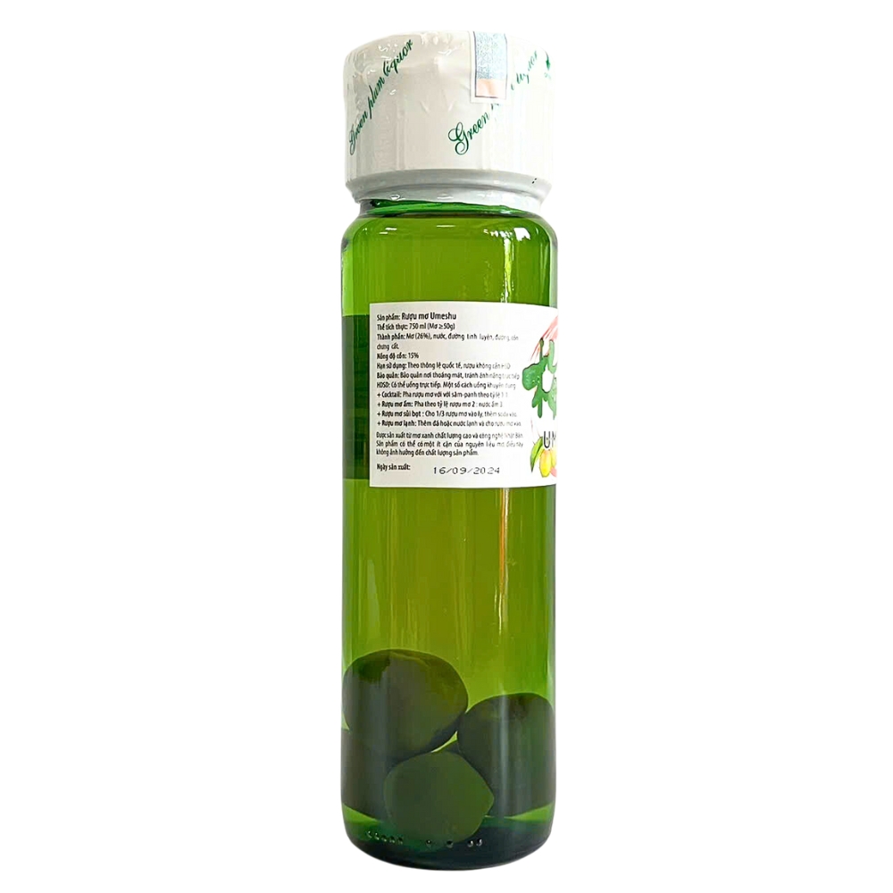 NGƯỜI DƯỚI 18 TUỔI KHÔNG ĐƯỢC UỐNG RƯỢU, BIA Xuất xứ: Nhật Bản Thành phần: Nước ép mơ (vùng Wakayama), đường, rượu chưng cất, trà xanh, chiết xuất trà xanh, hương mơ tự nhiên, màu cây sơn