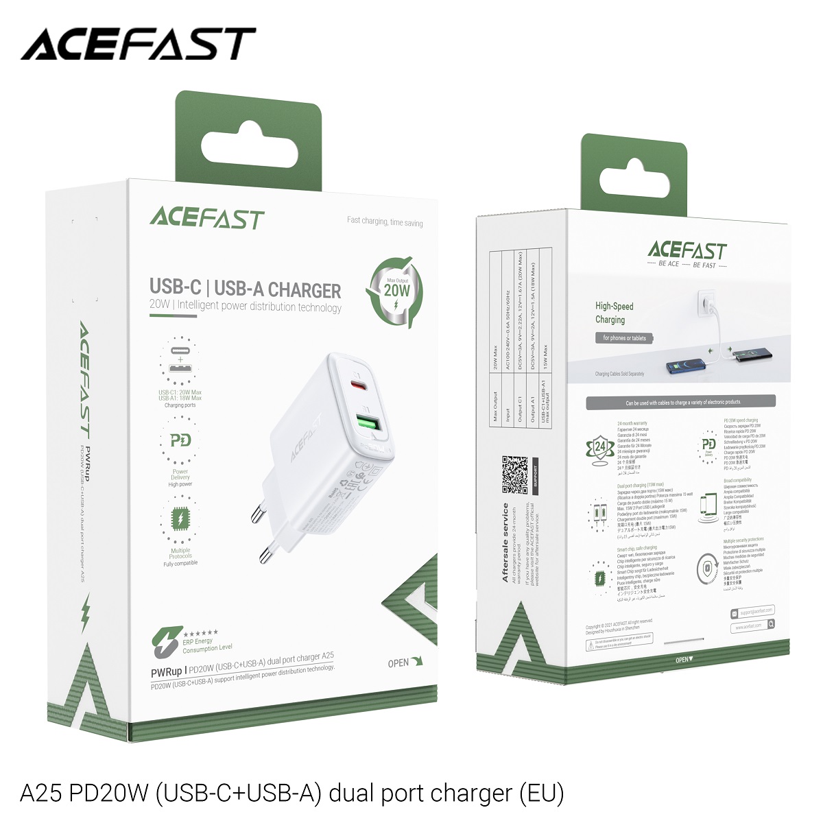 Mua tại TiktokSạc ACEFAST A25, 2 cổng USB-C+USB-A PD3.0 20W, phích cắm EU, hỗ trợ hầu hết các giao thức sạc nhanh. Thông số kỹ thuật: