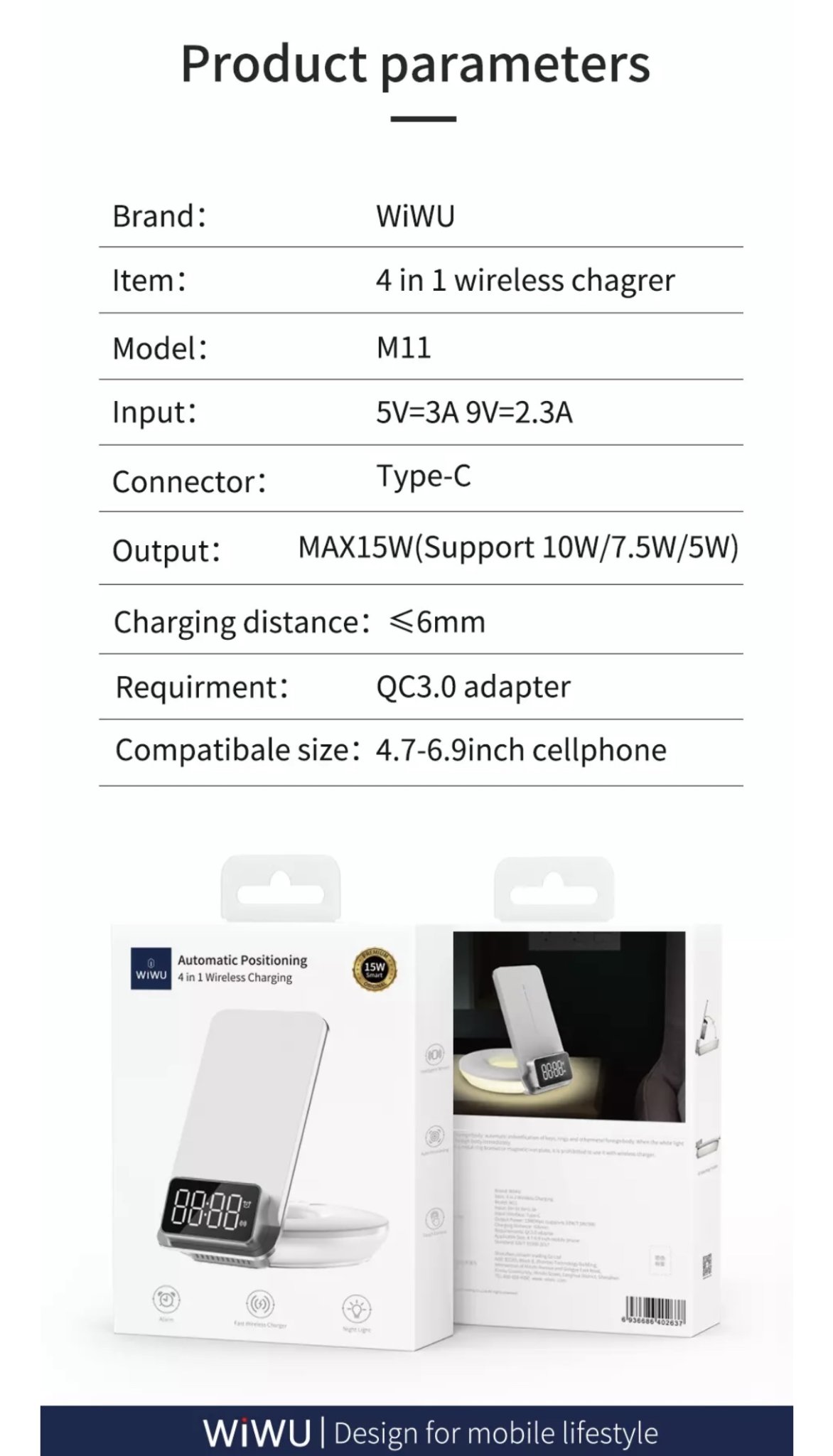 Sạc Wiwu Automatic Positioning 4 in 1 M11 Thương hiệu: Wiwu Mô tả sản phẩm - Chất liệu: hợp kim nhôm chất lượng cao và bền - Bộ sạc không dây 4 in 1 và là giá đỡ để bàn cho điện thoại - Hỗ trợ sạc không dây nhanh - Cuộn dây có thể tháo rời, ngang và dọc - Định vị chính xác - Sạc có chế độ đèn ban đêm ánh sáng dịu nhẹ và thoải mái - Xung quanh sạc ánh sáng ấm áp và sáng sủa - Điều chỉnh đa hướng sử dụng trong nhiều tình huống - Sạc có đồng hồ hiển thị giờ - Hỗ trợ cho tất cả các máy có chế độ sạc không dây. Bộ chuyển đổi dành cho di động 4.7- 6.9inch - Đầu ra: 5V = 3A 9V = 2.3A - Giao diện: loại C - Tỉ lệ đầu ra: 15W ( hỗ trợ 10W/7,5W,5W)