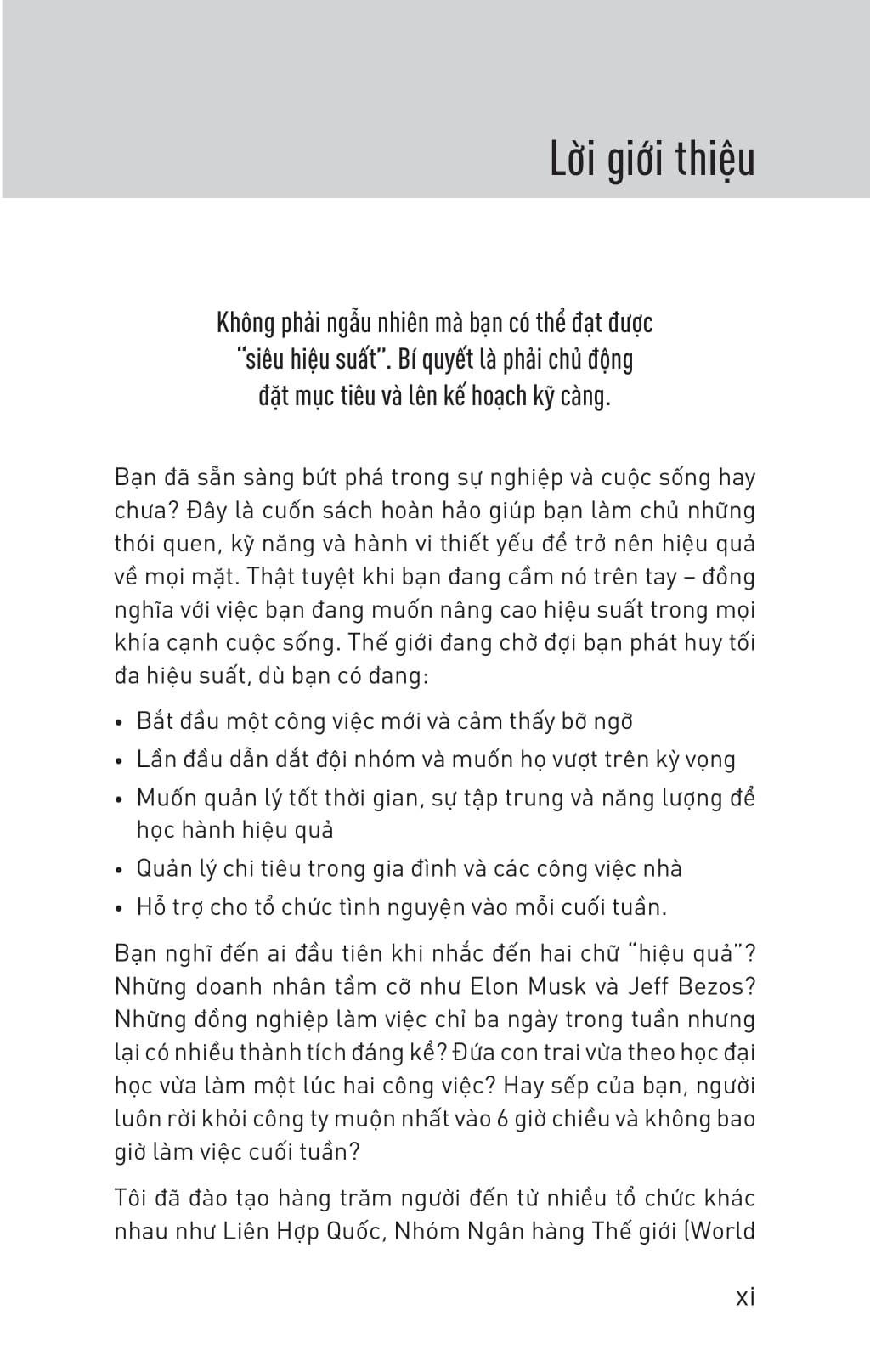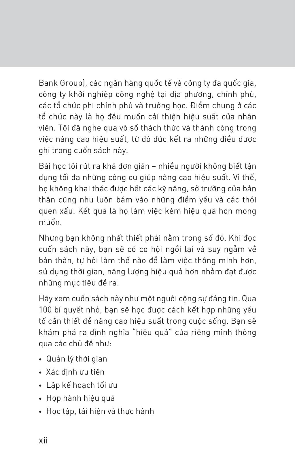 100 Bí Quyết Nâng Tầm Hiệu Suất - Những Thay Đổi Nhỏ Bứt Phá Thành Công Đây là cuốn sách hoàn hảo giúp bạn làm chủ những thói quen, kỹ năng và hành vi thiết yếu để trở nên hiệu quả về mọi mặt. 100 thói quen nâng tầm hiệu suất chứa đầy những ý tưởng tuyệt vời giúp bạn khám phá thói quen, công cụ, tư duy của những người có năng suất cao để làm việc thông minh hơn chứ không phải chăm chỉ hơn. Kết hợp những lời giải thích đơn giản với các hoạt động và bài tập, bạn sẽ học được kỹ năng và thói quen tối ưu để thành công.