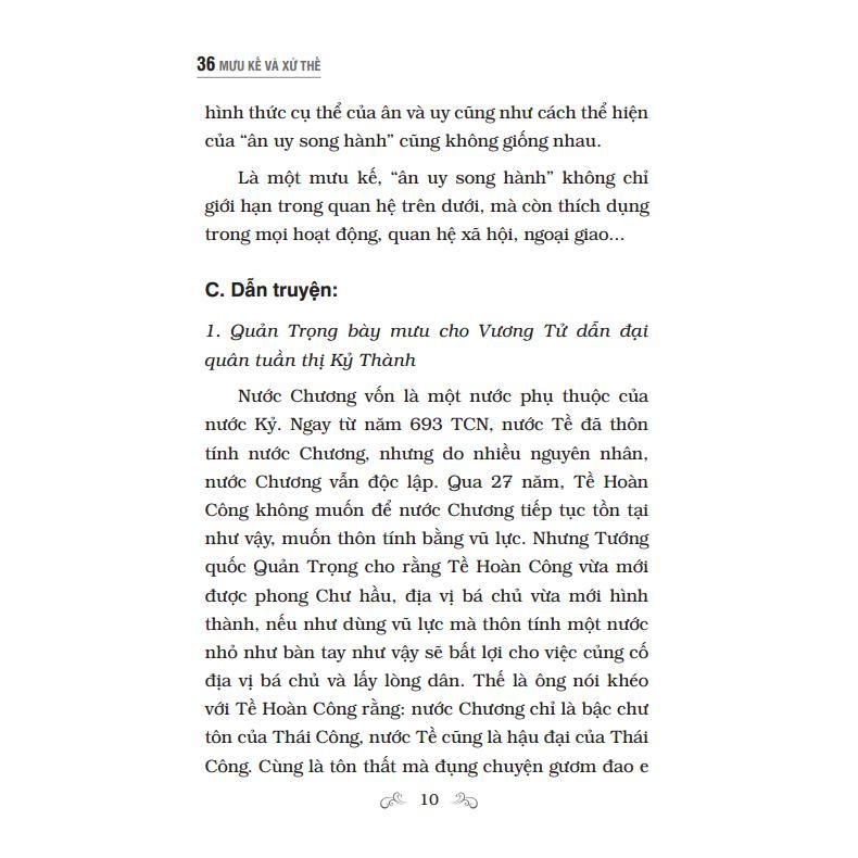 Trong cuộc sống, không phải chỉ cần sức mạnh là có thể vượt qua được mọi thử thách. Cuốn sách “36 Mưu Kế Và Xử Thế” sẽ chứng minh cho người đọc thấy rằng chiến trường, thương trường, thắng bại đều do khéo dùng mưu chứ không phải dùng sức. Mặc dù mục đích ban đầu của tác phẩm nổi tiếng này là để phục vụ quân sự nhưng cho đến ngày nay nó đa tạo ra sức ảnh hưởng bao trùm mọi lĩnh vực và có ý nghĩa đối với mọi thời đại.
