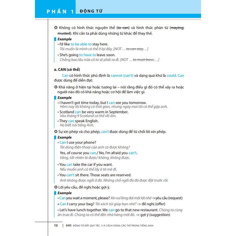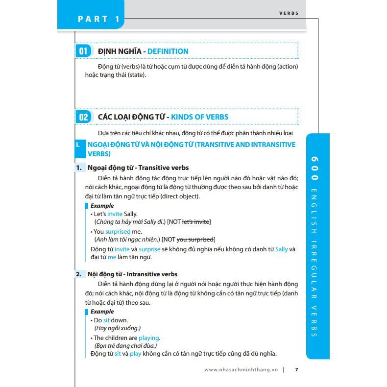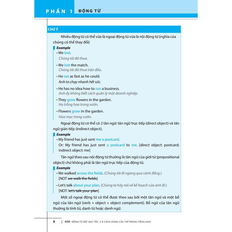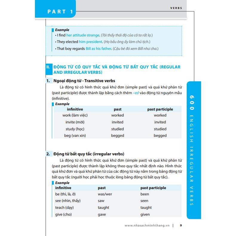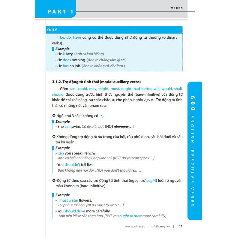 Cuốn 600 động từ bất quy tắc và các dùng các thì trong tiếng Anh rất quan trọng, giúp bạn chia động từ đúng với các thì tương ứng, từ đó làm bài tập, bài kiểm tra tiếng Anh hiệu quả. Nếu nắm vững bảng động từ bất quy tắc này, các bạn sẽ làm bài kiểm tra, bài thi tiếng Anh nhanh chóng và thuận tiện. Nội dung chính của cuốn sách gồm 6 phần: