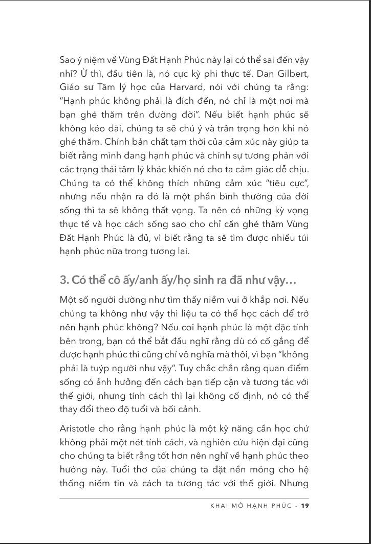 “Khai mở hạnh phúc” sẽ giúp bạn nuôi dưỡng những thói quen tích cực, tránh xa những thiên kiến tiêu cực, nhận thức linh hoạt, hiểu rõ cảm xúc của m.ình và tiến bước trên con đường hướng đến một phiên bản hạnh phúc hơn, mạnh khỏe hơn. Và hãy nhớ rằng: Hạnh phúc không phải là một đích đến hay một cảm xúc cụ thể nào đó, hạnh phúc là một quá trình.