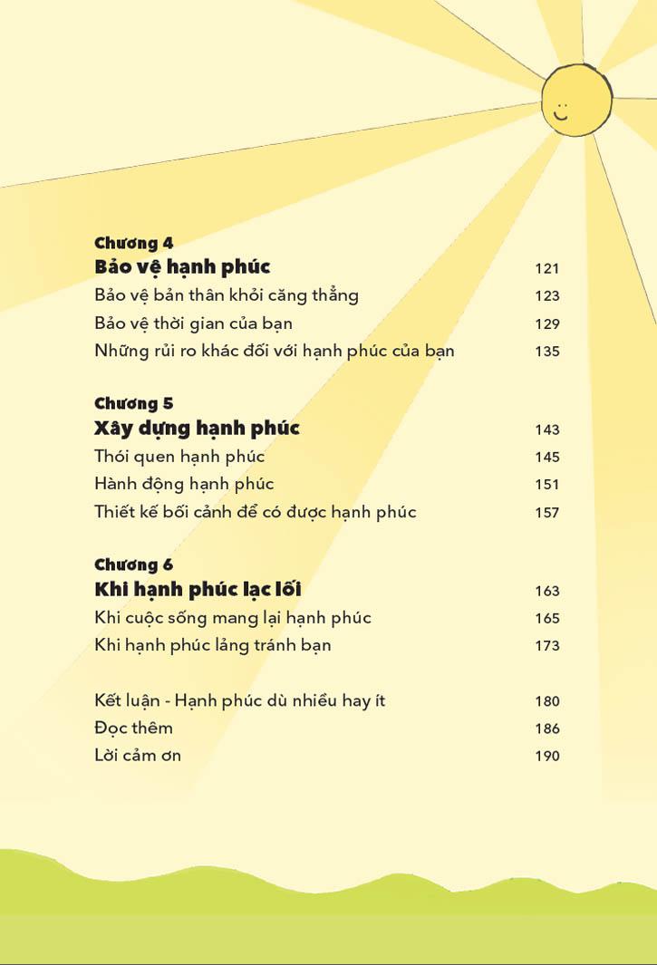 Trên nền tảng này, tác giả sẽ giới thiệu cho bạn những lầm tưởng về hạnh phúc, đồng thời ở mỗi chương đều có những công cụ thiết thực để hỗ trợ bạn trong ngày dông bão, đặc biệt là các bài tập cụ thể nhằm kích thích tư duy, nâng đỡ sức khỏe tinh thần trong đời sống hằng ngày.