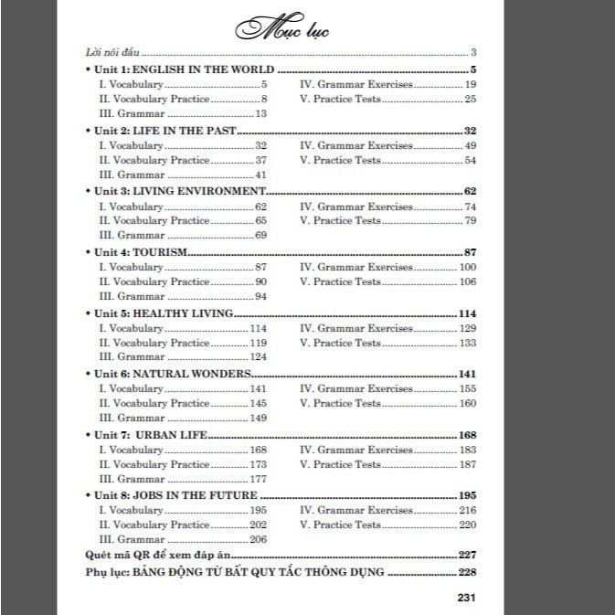 V. Practice Tests: Cuối mỗi Unit, chúng tôi biên soạn hai Practice Tests gồm nhiều dạng câu hỏi khác nhau với cả hai hình thức trắc nghiệm và tự luận. Mục đích các bài Practice Tests này nhằm giúp học sinh củng cố và nâng cao kiến thức từ vựng và ngữ pháp đã học trong mỗi Unit.