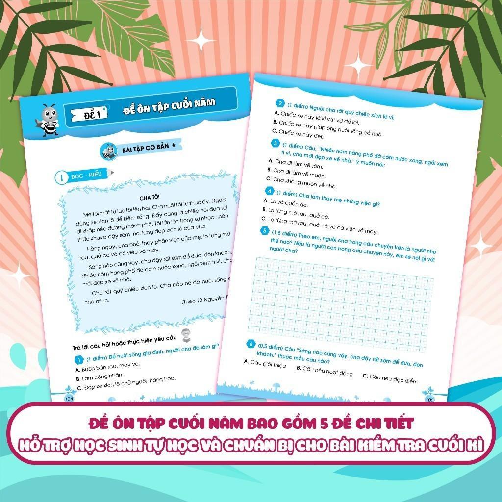 - Bài tập nâng cao: Phần này sẽ cung cấp 1 số các bài tập và hoạt động mang tính thử thách hơn, để các em thử sức, luyện tập tư duy sâu từ đó trau dồi và nâng cao kiến thức. Cuốn sách cũng cung cấp 5 đề ôn tập cuối kì với thang điểm cụ thể, để các em tự ôn luyện và đánh giá đúng mức độ nắm kiến thức, chuẩn bị tốt kiến thức và tâm lý cho bài kiểm tra cuối kì.