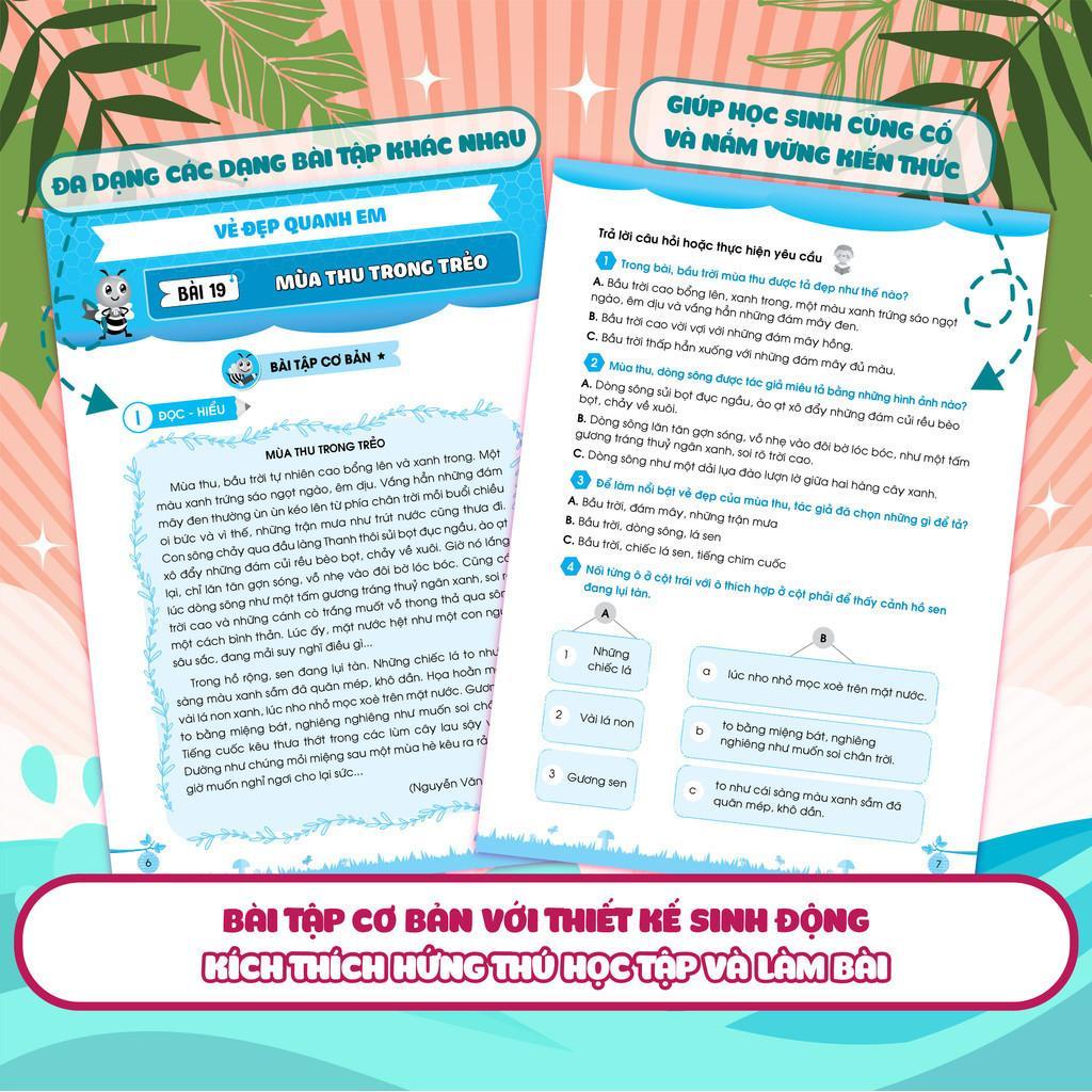 - Bài tập cơ bản: Các bài tập trong phần này được thiết kế sinh động, đầy cảm hứng với rất nhiều các hoạt động giúp khơi gợi hứng thú học và làm bài tập của các em, đồng thời giúp các em củng cố và nắm chắc các kiến thức Tiếng Việt đã học.