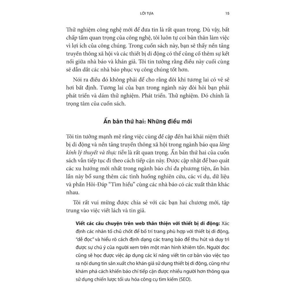 Mã hàng 89349742627 Tên Nhà Cung Cấp NXB Trẻ Tác giả Anthony Adornato Người Dịch My Trần, Thiện Trần NXB Trẻ Năm XB 2025 Trọng lượng (gr) 500 Kích Thước Bao Bì 20 x 14 x 2.4 cm Số trang 480 Hình thức Bìa Mềm Báo Chí Trên Thiết Bị Di Động Và Nền Tảng Truyền Thông Xã Hội Kết hợp lý thuyết và thực hành, cuốn sách bao gồm các danh sách kiểm tra và các hoạt động thực tế trong mỗi chương, cho phép người đọc xây dựng ngay các kỹ năng truyền thông xã hội và di động mà các nhà báo ngày nay cần và các tổ chức tin tức mong đợi. Phiên bản thứ hai vẫn tập trung vào các giá trị cốt lõi của báo chí, chẳng hạn như xác thực, xác minh và độ tin cậy, đồng thời hướng dẫn người đọc cách áp dụng chúng vào các hoạt động truyền thông kỹ thuật số. Cuốn sách cũng đưa ra một cuộc thảo luận chuyên sâu về vai trò tích cực của khán giả trong việc sản xuất nội dung, cách thiết bị di động và mạng xã hội đã thay đổi cách khán giả tiếp nhận tin tức cũng như ý nghĩa của những thay đổi này đối với các nhà báo. Bằng một lối tiếp cận đa dạng và bền bỉ, tương tự như mẫu hình nhà báo mà ông đang cố gắng xây dựng trong cuốn sách này, Adornato trang bị cho các nhà báo tương lai những chiến lược trọng tâm của ngành công nghiệp tin tức - sự minh xác và tính khách quan - bởi chúng liên quan và tác động trực tiếp đến các hoạt động truyền thông xã hội, nhằm duy trì các tiêu chuẩn cốt lõi làm nên báo chí trong thời đại này.