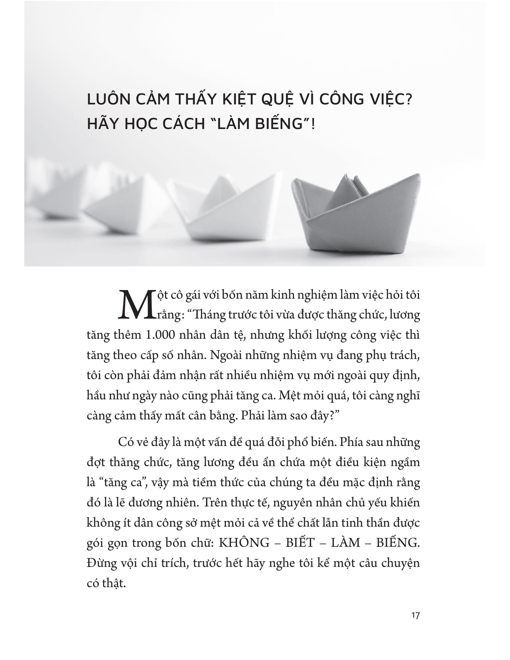 - Việc bạn làm sau giờ làm việc quyết định sự chênh lệch giữa bạn và người khác Trong cuốn sách Biến Nỗ Lực Thành Vàng Ròng, tác giả Lâm Công Tử nói về những chuyện mà bạn quen thuộc hoặc từng trải qua nơi công sở. Trong đó không ít kinh nghiệm thực tế kết hợp với logic và tư duy mới mẻ đáng để ta học hỏi, hỗ trợ bạn nâng cao chất lượng cuộc sống nơi công sở. Thời gian sau khi tan sở là chiến trường kéo giãn sự chênh lệch giữa chúng ta. Đa số người có nguồn tài nguyên lớn hơn so với bạn đồng trang lứa đều có điểm chung là cách họ nghiêm túc tận dụng thời gian sau khi tan sở. Thậm chí có người còn duy trì trạng thái làm việc quanh năm suốt tháng, coi đó như một thói quen. Biên giới nhận thức của bản thân càng lớn thì cơ hội tiềm tàng càng nhiều. Dù ở giai đoạn nào trong cuộc đời, chúng ta đều có chung một nỗi băn khoăn: Tại sao cơ hội chẳng bao giờ đến với m.ình? Trên thực tế, trong suốt cuộc đời m.ình, chúng ta sẽ gặp được rất nhiều bước ngoặt. Tuy nhiên đại đa số chúng ta lại thường không phán đoán được cơ hội, ngay cả khi phát hiện ra cũng không biết cách nắm bắt. Vậy nên chúng ta cần sử dụng công cụ tư duy một cách có ý thức, giúp bản thân có thể đưa ra những quyết định có lợi nhất cho tương lai.