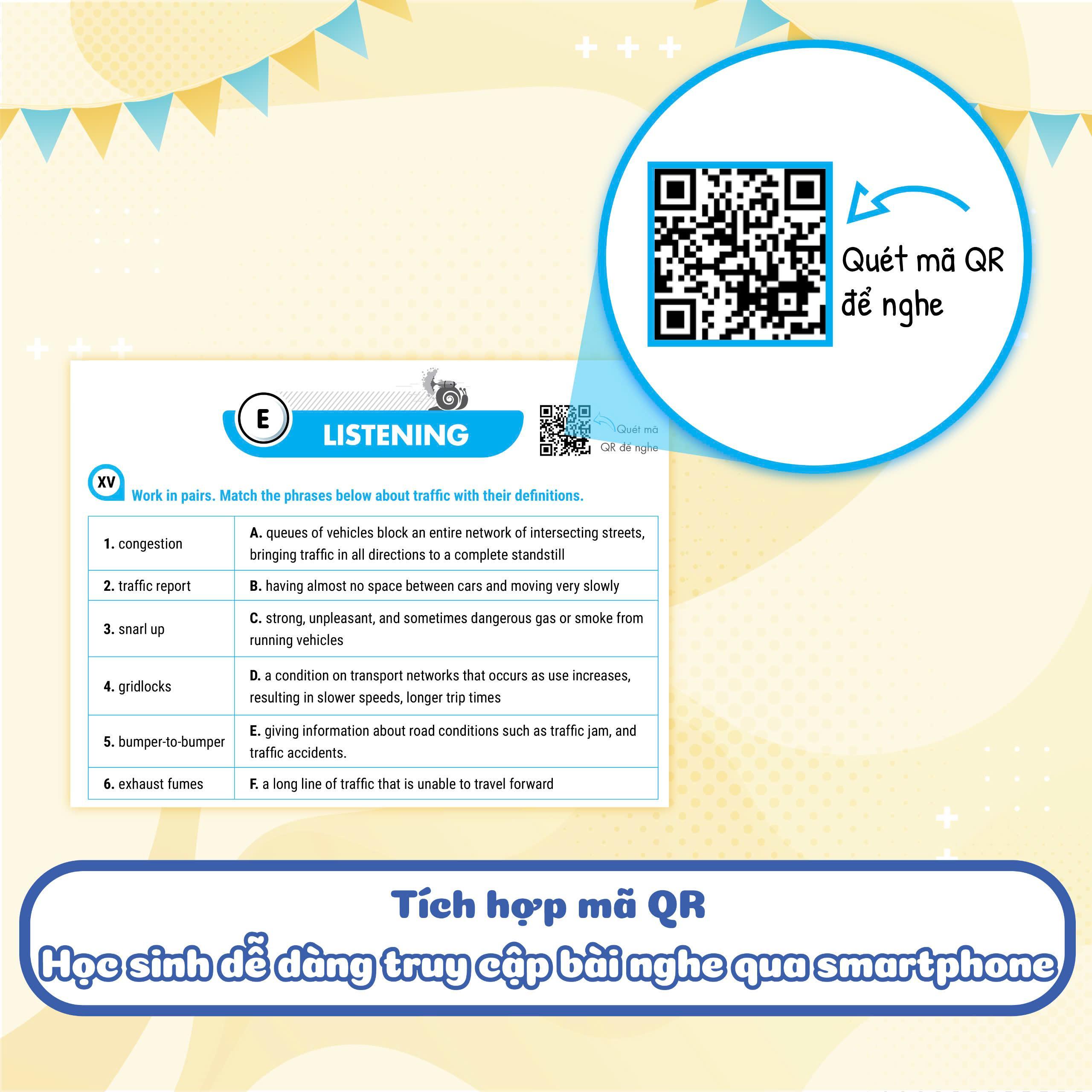 - File nghe QR code hiện đại và tiện dụng Một điểm đặc biệt của bộ sách đó là tính hiện đại và sự tiện dụng khi các em không cần sử dụng CD để có được bài nghe. Bộ sách được tích hợp mã QR và mã Code giúp các em dễ dàng có được file nghe chỉ với 1 chiếc smartphone, giúp rút ngắn thời gian tìm file