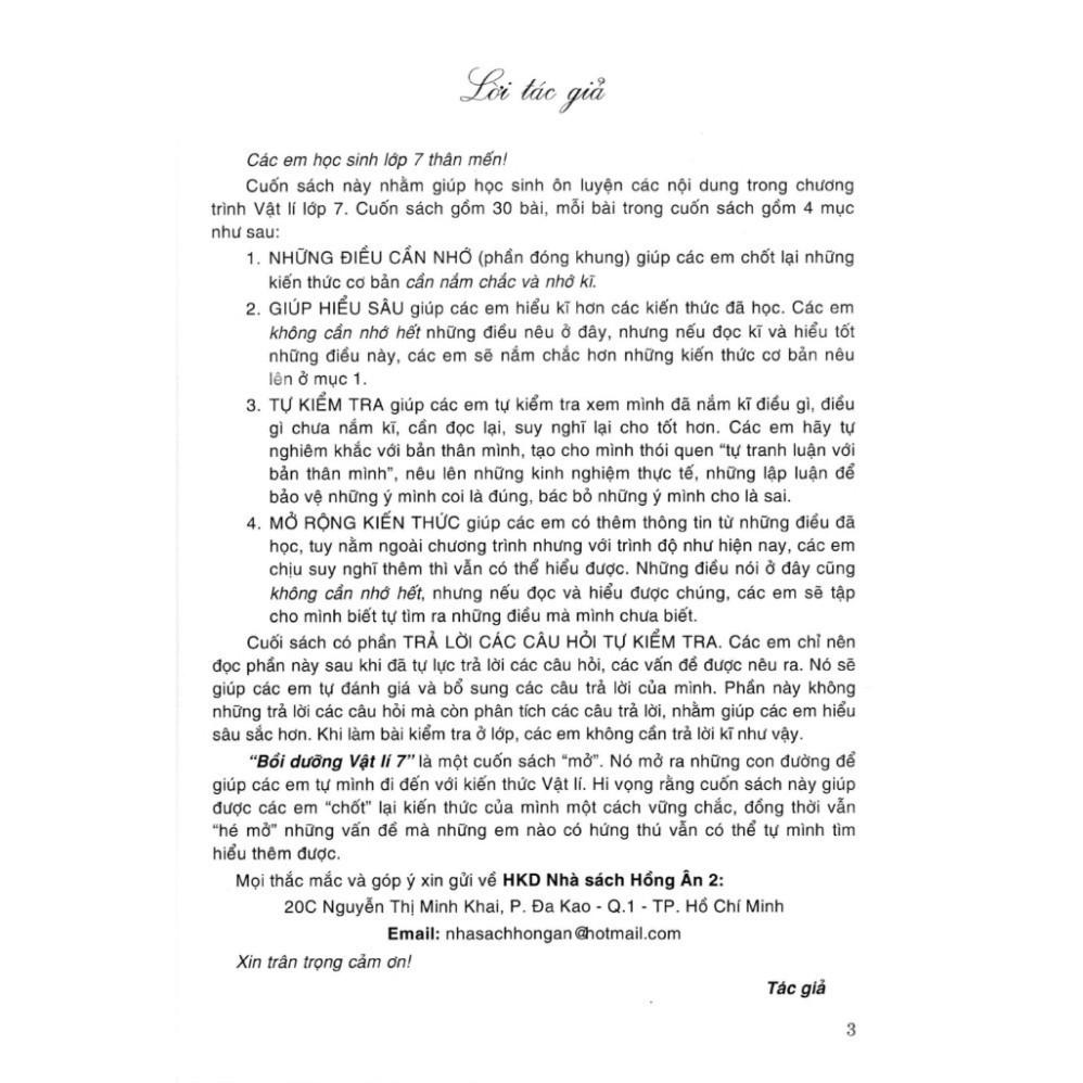 “Bồi dưỡng Vật lí 7” là một cuốn sách “mở”. Nó mở ra những con đường để giúp các em tự mình đi đến với kiến thức Vật lí. Hi vọng rằng cuốn sách này giúp được các em “chốt” lại kiến thức của mình một cách vững chắc, đồng thời vẫn “hé mở” những vấn đề mà những em nào có hứng thú vẫn có thể tự mình tìm hiểu thêm được.