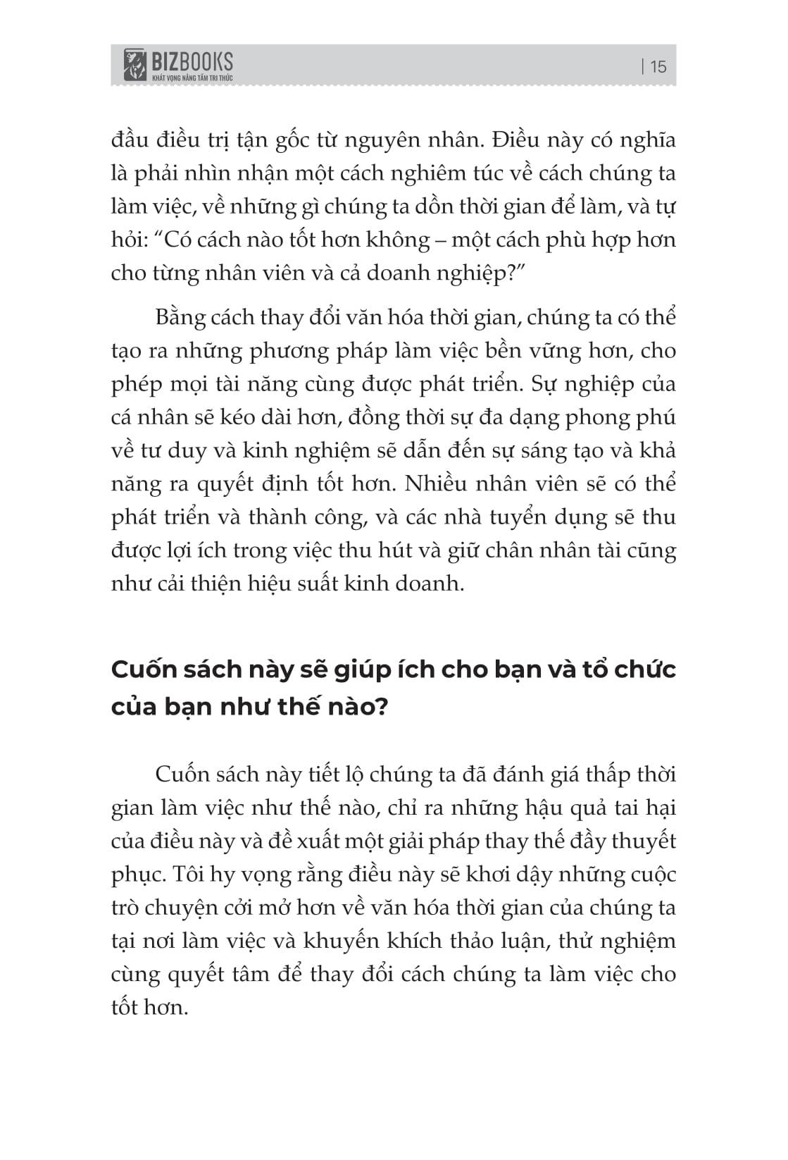 Sang phần thứ hai, “Tái cấu trúc thời gian”, cuốn sách chuyển từ chẩn đoán sang hành động. Helen Beedham vẽ nên bức tranh về một tổ chức “chủ trọng thời gian” – nơi các quyết định không xoay quanh số giờ làm việc mà tập trung vào kết quả, nơi công việc được thiết kế có chủ đích và nhân viên được trao quyền tự chủ.