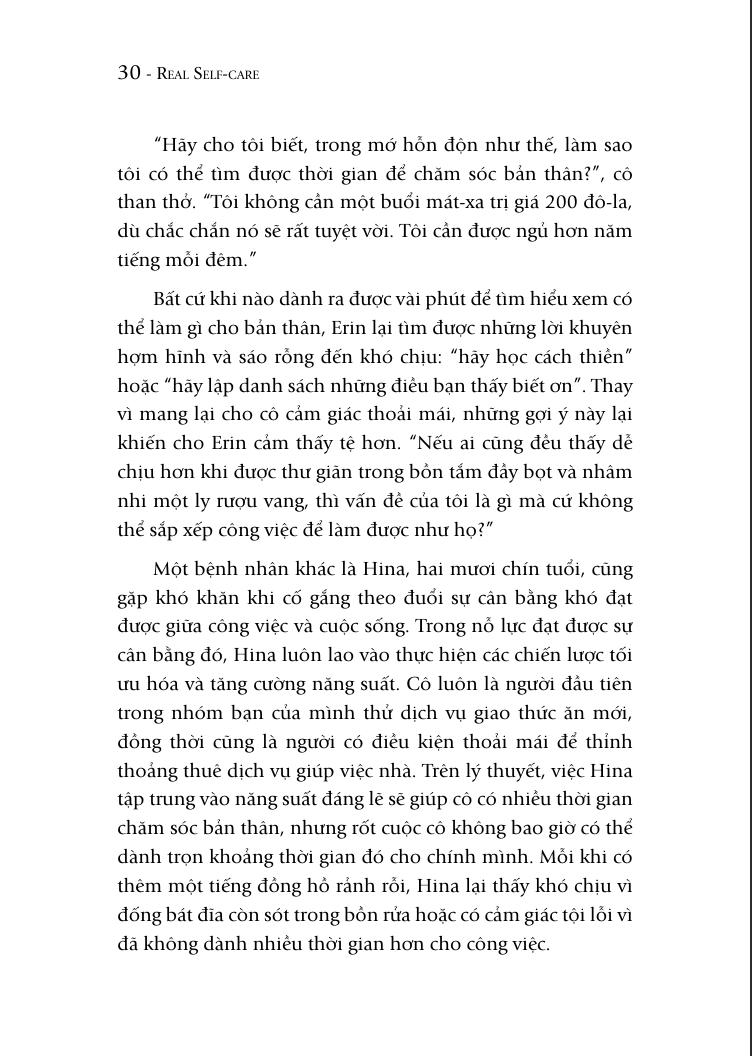 Nếu bạn từng cảm thấy mệt mỏi với những lời khuyên sáo rỗng về chăm sóc bản thân, nếu bạn muốn tìm một cách tiếp cận thật sự hiệu quả từ một chuyên gia nhiều kinh nghiệm, “Chăm sóc bản thân thật sự” là quyển sách dành cho bạn. Đọc quyển sách này, bạn sẽ học được cách yêu thương bản thân thay vì lúc nào cũng chạy theo những tiêu chuẩn do xã hội áp đặt.