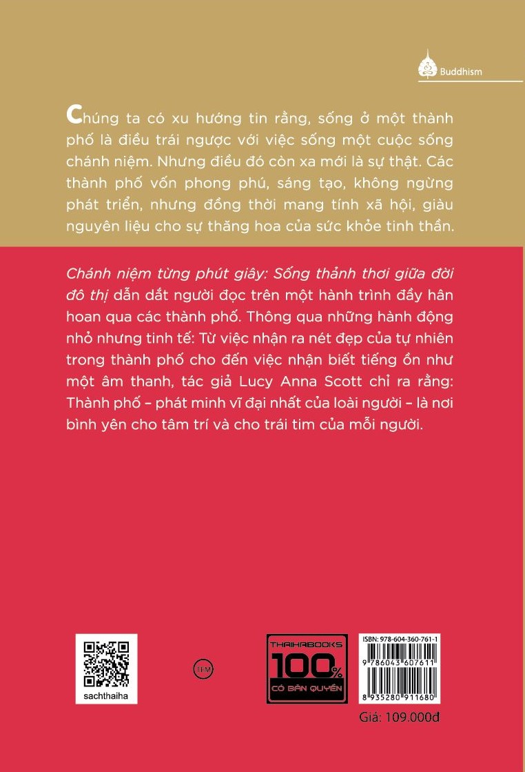 Chánh niệm là sống trọn vẹn trong từng khoảnh khắc và kéo dài khoảnh khắc đó vào miền vĩnh cửu của linh hồn. Kết nối một cách đầy ý nghĩa với lịch sử ẩm thực của con người có thể đem lại cảm giác về sự nhận thức mở rộng này. Cuộc sống thành thị vốn được ngầm định là quá huyên náo để đem đến sự yên bình, quá áp lực để cho phép bản thân được kết nối với thực tại – trong từng khoảnh khắc, với những con người khác, và cả với chính bản thân. cuốn sách này sẽ cho bạn thấy giá trị của một thành phố – một môi trường cho phép bạn được nhìn, nghe và cảm nhận nhiều hơn. Nhiều cư dân thành phố có thể lý tưởng hóa việc đánh đổi những căn hộ nhỏ-cỡ-tem-thư của họ để lấy một căn nhà yên tĩnh bên bờ biển. Việc làm để gần gũi thiên nhiên hơn như vậy – mặc dù cũng quan trọng cho tâm hồn – chưa chắc sẽ đem lại sự kết nối như khi ta ở cùng với những con người khác.  Đây là cuốn sách nằm trong bộ “Chánh niệm từng phút giây”. Cuốn sách gợi mở những suy nghĩ mới về cuộc sống thành thị – như một cách tiếp cận có “chánh niệm” hơn với cuộc sống. Cuộc sống chánh niệm đến từ việc hiểu thành phố sâu sắc hơn – khám phá những tầng lớp của nó, đào sâu bên dưới sự ồn ào, sương mù, và các đám đông. Mục lục: Lời giới thiệu: Thông điệp từ một người yêu thành phố  Một phần của thành phố chánh niệm Hít thở cùng những cái cây  Một chân trời mới  Ngắm chim bay  Nghệ thuật ngắm nhìn  Học cách lạc quan  Trân trọng sự hỗn loạn  Niềm vui của cuộc sống nhỏ bé Trân trọng sự tháo vát Kết nối với những giác quan Miệt mài trong sự thay đổi Tìm cái đẹp trong dạng thức Khám phá âm nhạc Qua con mắt của những người khác Tạo ra những ký ức tâm hồn Ngôi nhà cho những người hướng nội Nơi ẩn náu trong thành phố Đi dạo ban đêm Sắc màu của mùa đông Hãy để mưa xoa dịu bạn Tạo ra một ốc đảo hoang dã Tin thành phố Xây dựng thành phố chung Ở bên những người khác Yêu giống loài đô thị   Tác giả: Lucy Anna Scott là một nhà văn có niềm yêu thích nghệ thuật với những câu chuyện khám phá cách thực vật, cây cối và phong cảnh giúp chúng ta hiểu rõ hơn về bản thân. Cô đồng sáng lập Lost in London , một tạp chí indie chuyên khám phá những cảnh quan hoang dã của thành phố. Những cuốn sách trước đây của cô bao gồm Lạc lối ở London: những cuộc phiêu lưu ngoài trời hoang dã của thành phố và Khu vườn tí hon của tôi    Trích đoạn nội dung: