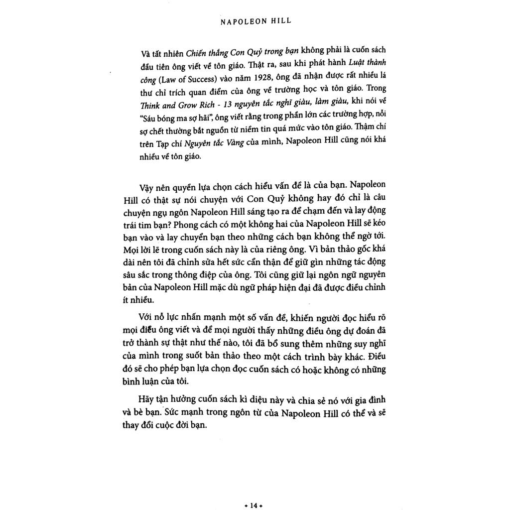 Cuốn sách là cuộc trò chuyện của Napoleon Hill và Con Quỷ. Sau bao nhiêu năm miệt mài nghiên cứu cuối cùng ông cũng phát hiện ra Con Quỷ, bắt nó phải thú tội và tiết lộ những sự thật kinh hoàng về nơi nó sống, cách nó kiểm soát tâm trí con người và cách để con người chiến thắng được nó. Khi đọc cuốn sách này, có thể bạn sẽ tự hỏi, cuộc trò chuyện này có thật không? Con Quỷ là có thật hay là một sản phẩm của trí tưởng tượng của Napoleon Hill. Nhưng quyền lựa chọn cách hiểu vấn đề là của bạn. Bởi lẽ cuối cùng, thông qua cuộc trò chuyện với Con Quỷ, Napoleon Hill đã cung cấp cho chúng ta chìa khóa để chiến thắng Con Quỷ trong cuộc sống riêng của mỗi người.