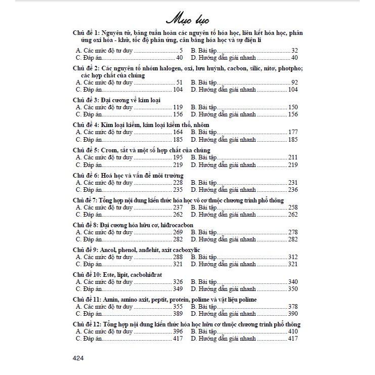 Sách - Chinh phục câu hỏi lí thuyết hóa học theo chủ đề ôn thi THPT quốc gia (dùng chung các bộ sgk hiện hành) - HA Các em học sinh thân mến! Trong đề thi THPT quốc gia môn Hóa học năm 2015 có tới 56% số câu hỏi lí thuyết, trải đều khắp chương trình hóa học phổ thông với bốn mức độ tư duy là nhận biết, thông hiểu, vận dụng và vận dụng cao. Như vậy, để có kết quả cao nhất đòi hỏi người học phải nắm vững và vận dụng linh hoạt kiến thức lí thuyết đã học để giải quyết nhanh các tình huống có vấn đề mà mỗi bài toán đã đưa ra. Trong nhiều năm dạy luyện thi Đại học và Cao đẳng, chúng tôi nhận thấy học sinh thường mất điểm ở những câu hỏi lí thuyết. Trên thị trường hiện nay, chưa có một cuốn sách nào chuyên viết về lí thuyết mà ở đó phân loại các câu hỏi theo các chủ đề và mức độ tư duy đúng như trong ma trận đề THPT quốc gia của Bộ GD và ĐT. Vì vậy, việc biên soạn một cuốn sách đáp ứng những nội dung như trên là rất cần thiết. Nhằm giúp đỡ các em trong quá trình ôn tập, củng cố kiến thức, chuẩn bị tốt nhất cho kì thi THPT quốc gia, chúng tôi biên soạn cuốn sách: CHINH PHỤC CÂU HỎI LÍ THUYẾT HÓA HỌC THEO CHỦ ĐỀ Cuốn sách được chia làm 12 chủ đề kiến thức theo đúng ma trận đề thi THPT quốc gia. Trong mỗi chủ đề chúng tôi đều đưa ra các câu hỏi từ dễ đến khó với các mức độ tư duy từ thấp đến cao để các em rèn luyện năng lực tư duy của mình đồng thời cũng phù hợp với mỗi đối tượng học sinh. Các em chỉ thi tốt nghiệp thì làm các câu hỏi ở mức độ nhận biết, thông hiểu. Các em dùng kết quả để xét tuyển vào các trường Đại học và Cao đẳng thì cần làm thêm các câu hỏi ở mức độ vận dụng và vận dụng cao. Chúng tôi hy vọng rằng, cuốn sách là tài liệu quý báu góp phần nâng cao kết quả học tập bộ môn Hóa học cho các em học sinh ở các trường THPT. Dù đã hết sức cố gắng trong quá trình biên soạn, nhưng cuốn sách khó tránh khỏi những thiếu sót nhất định. Các tác giả chân thành cảm ơn ý kiến đóng góp của quý thầy giáo, cô giáo và các em học sinh gần xa để lần tái bản sau cuốn sách được hoàn thiện hơn Công ty phát hành Nhà Sách Hồng Ân Tác Giả: Nhiều tác giả Năm Xuất Bản: 2024 Kích Thước: 17 x 24 cm Số Trang: 424 Nhà Xuất bản Đại Học Quốc Gia Hà Nội Bìa Mềm