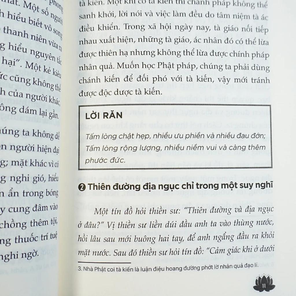 Nhiều người nghĩ rằng, cuộc đời vốn đầy dẫy những nhiễm ô, tệ nạn, cám dỗ nên khó giữ tâm trong sạch. Họ ước muốn có một hoàn cảnh sống tốt hơn để có thể tu tập mà nào đâu hay rằng từ trong tâm sẽ dẫn dắt hành động, từ hành động mà tạo ra nhân quả. Nếu có lòng từ bi, nhà tù cũng là thiên đường; nếu trong lòng nặng trĩu phiền não và buồn sầu, thiên đường cũng là địa ngục.